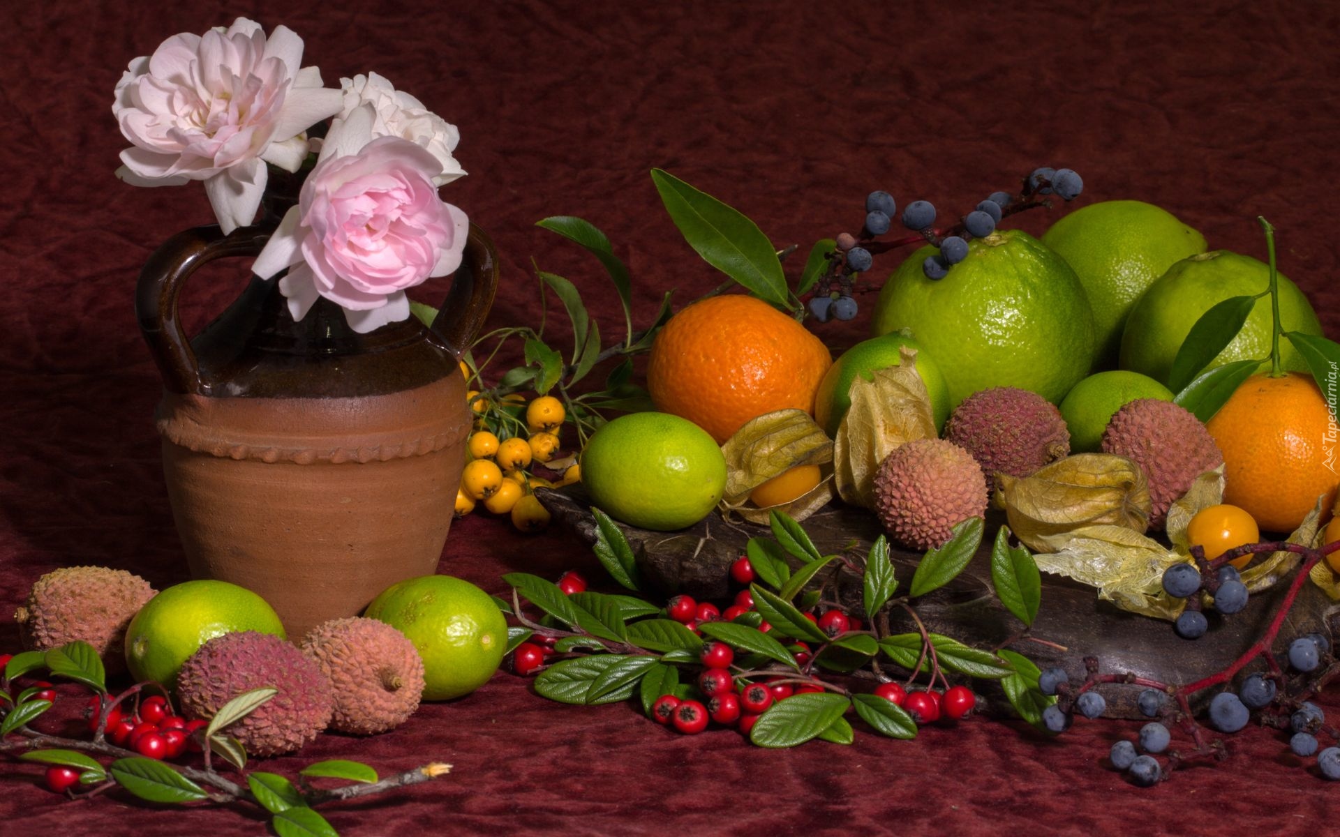 Edytor tapety: Kwiaty w wazoniku obok owoców