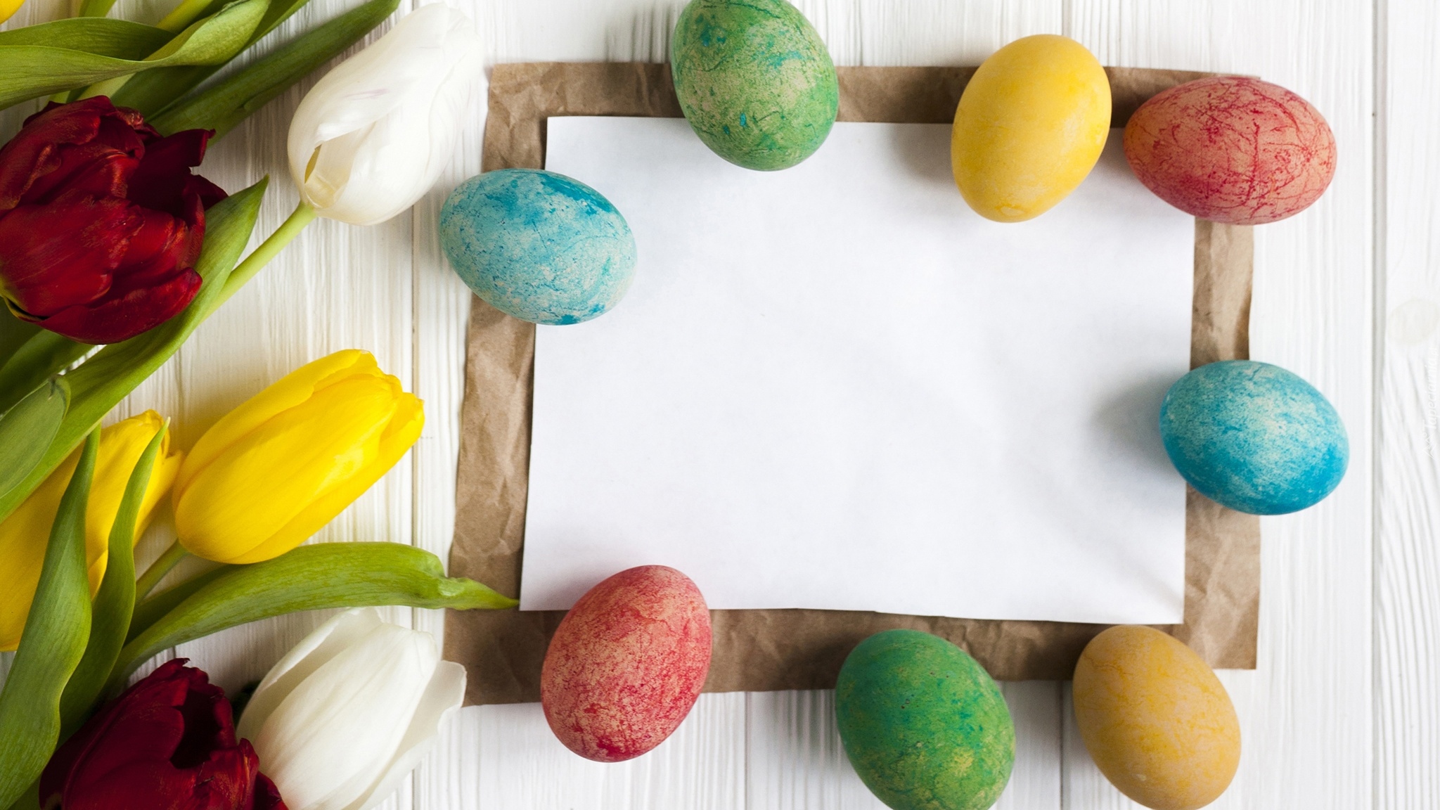 Edytor tapety: Kolorowe tulipany i pisanki na kartce