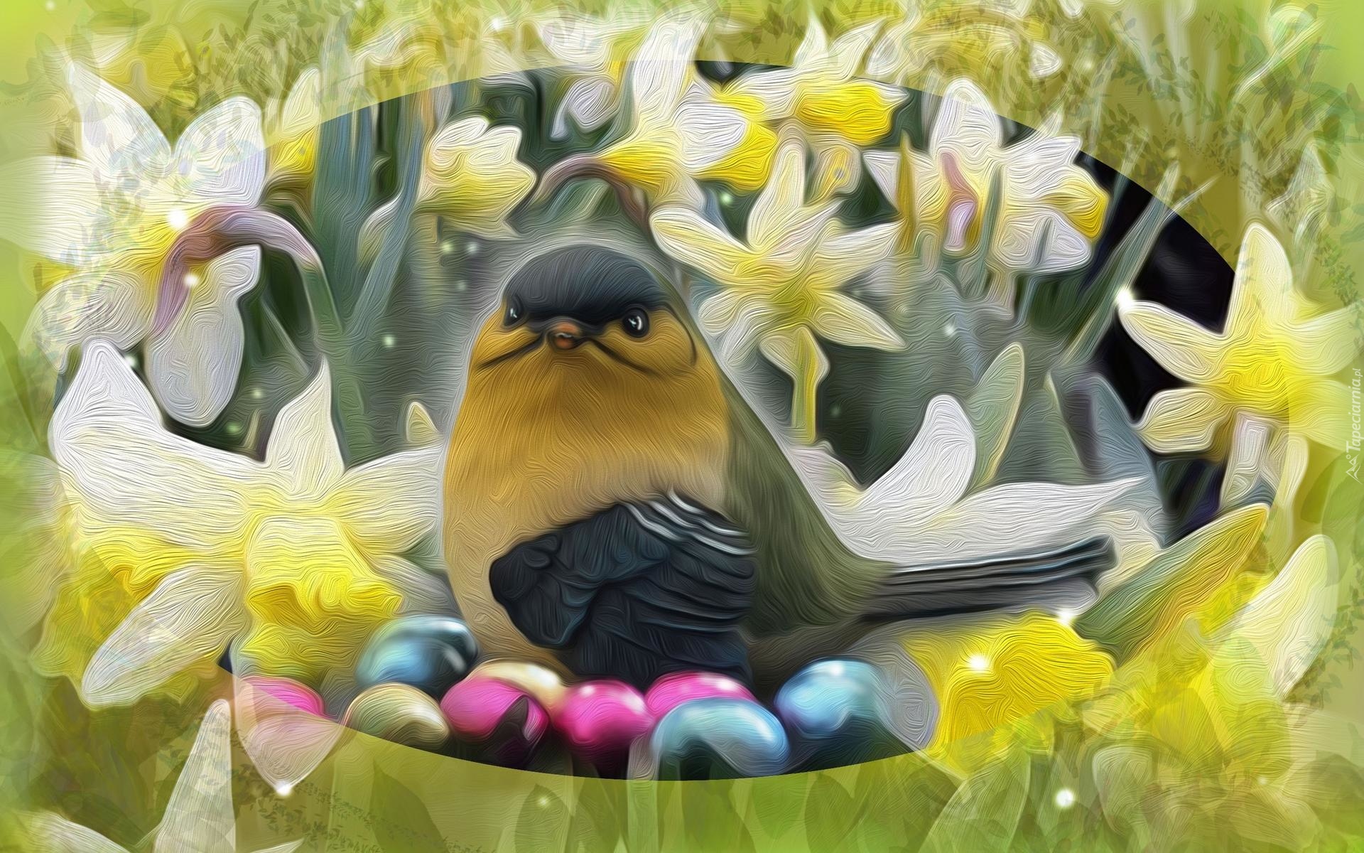 Edytor tapety: Ptaszek na pisankach przy wiosennych żonkilach