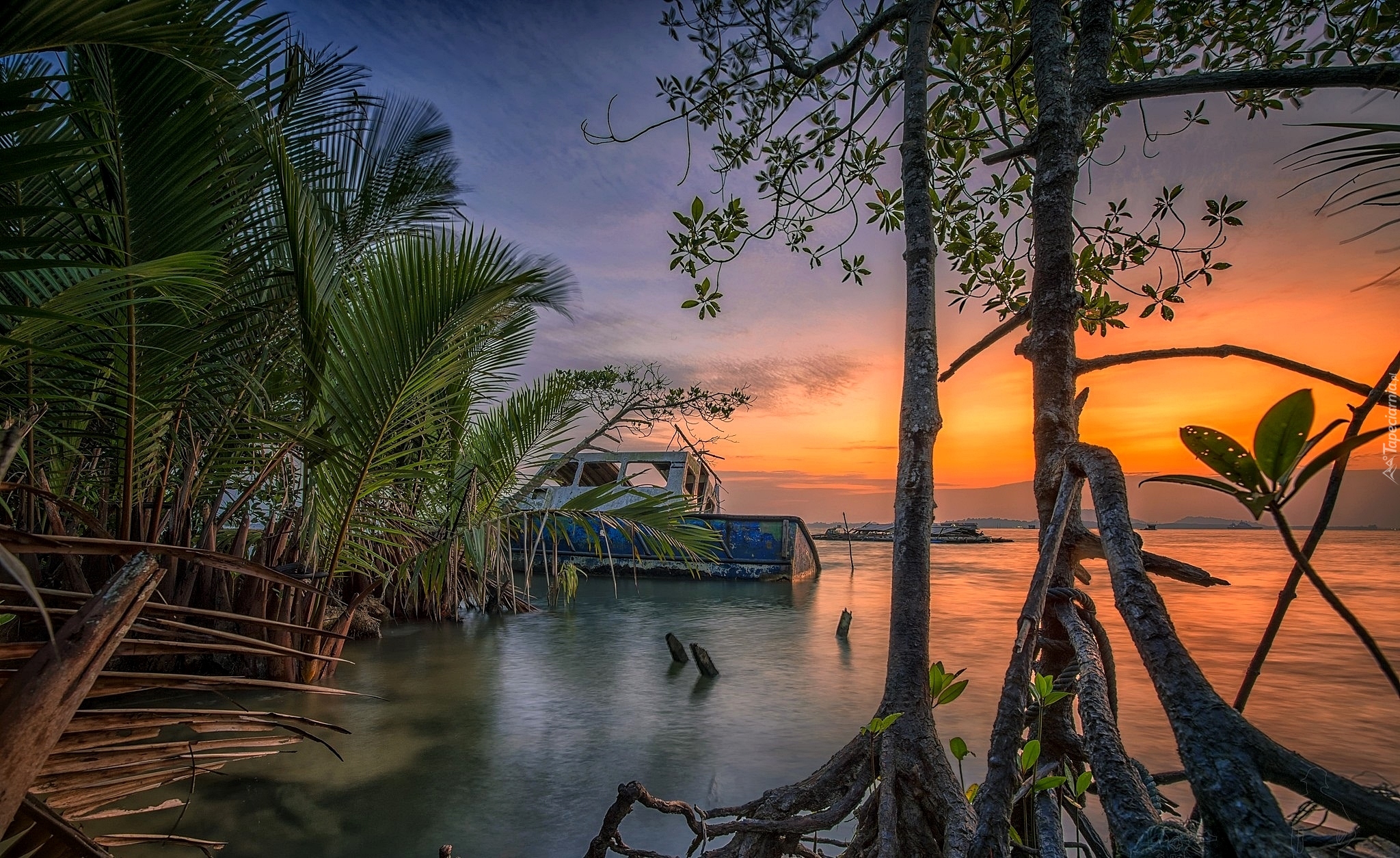 Edytor tapety: Palmy przy brzegu morza o zachodzie słońca