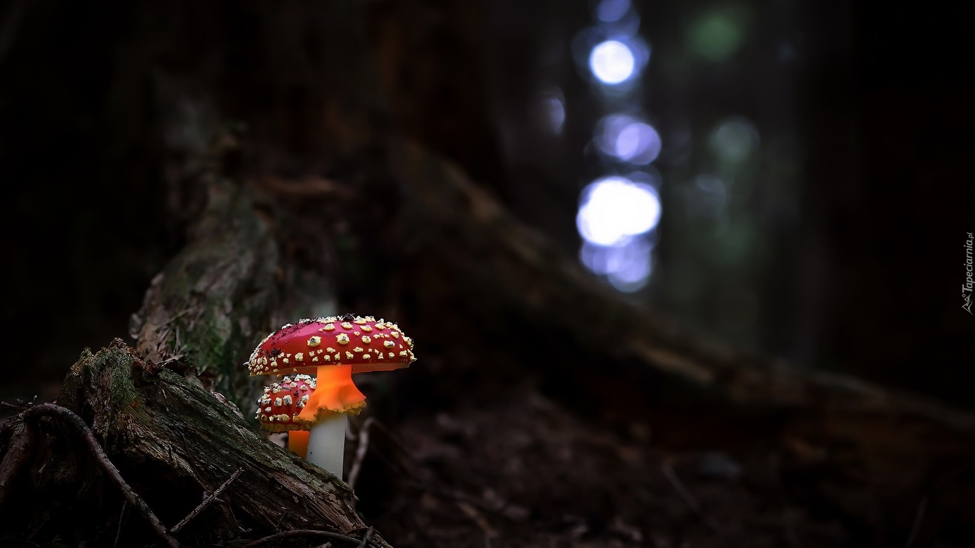 Edytor tapety: Dwa muchomory przy pniu drzewa