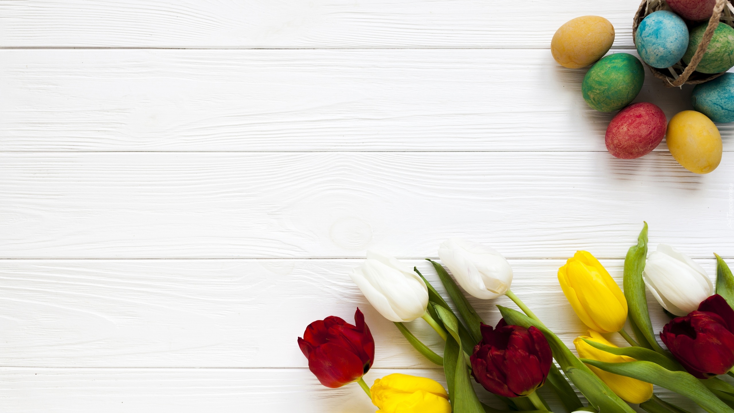 Edytor tapety: Kolorowe pisanki i tulipany na deskach