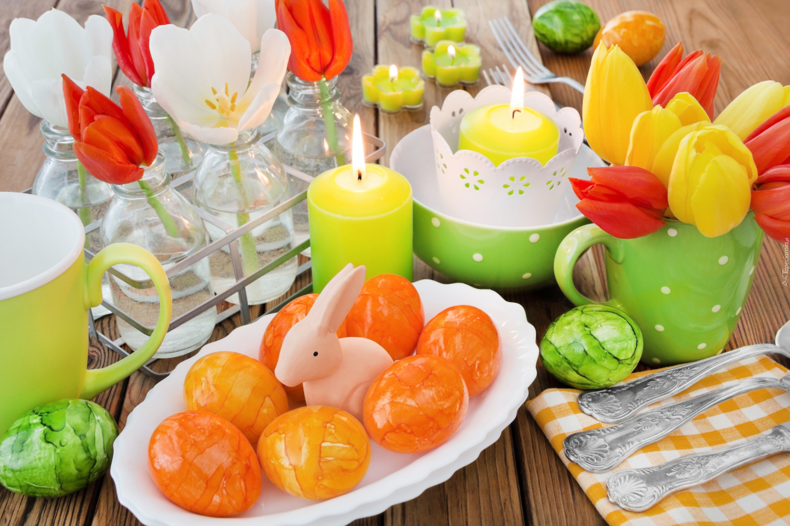 Edytor tapety: Zajączek między pisankami koło świec i tulipanów