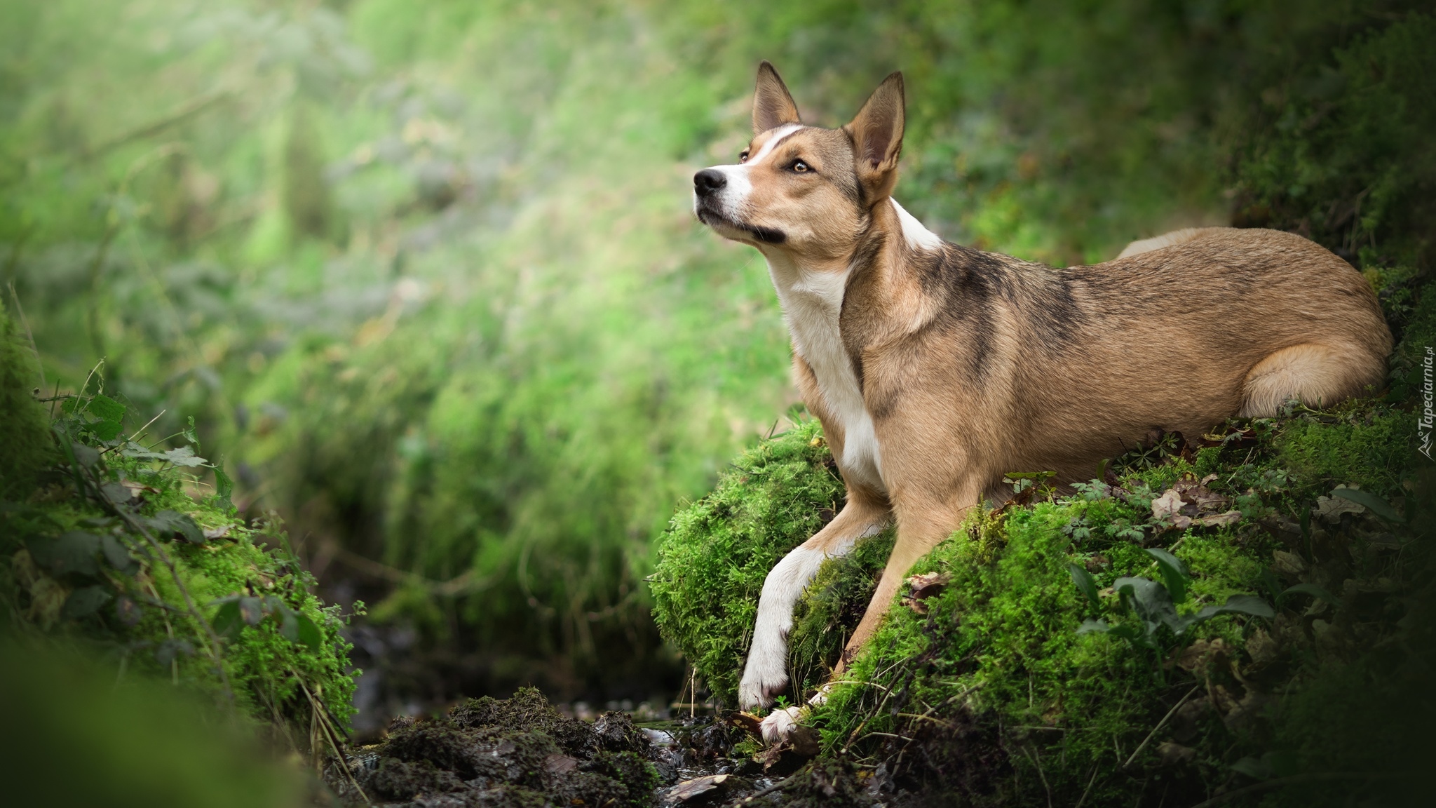 Edytor tapety: Pies leżący na mchu