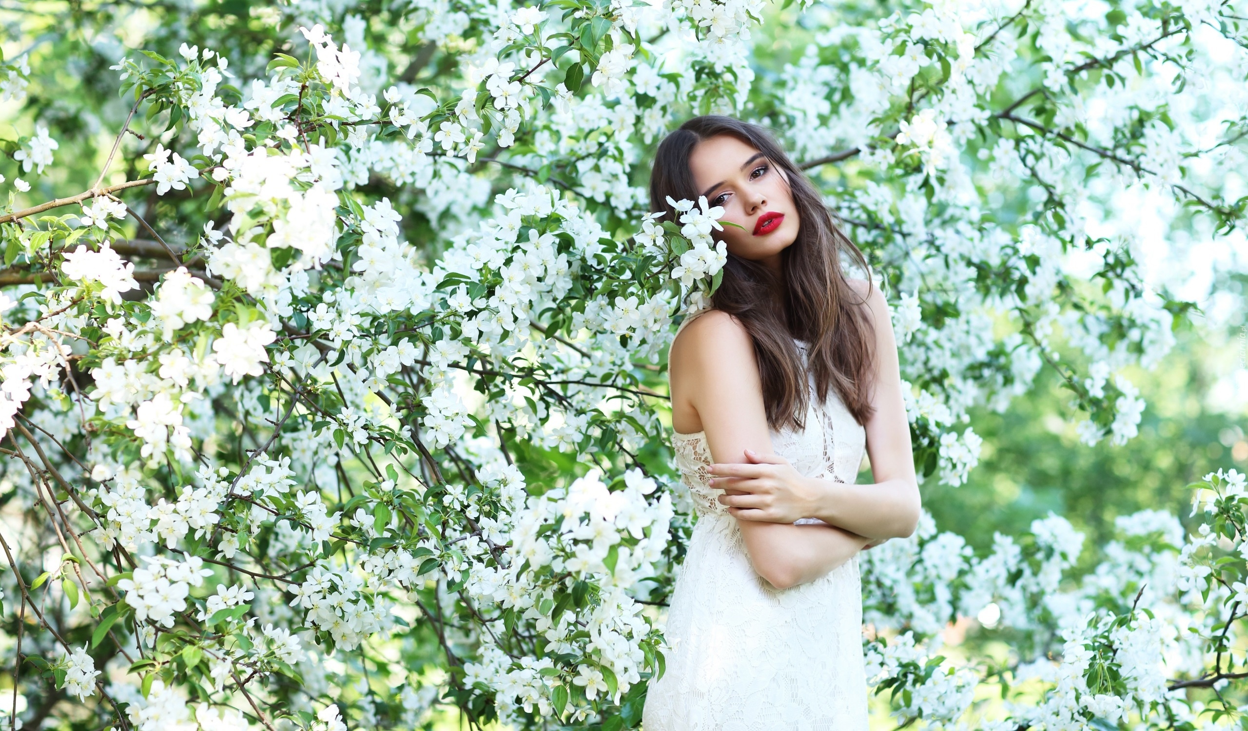 Edytor tapety: Szatynka w białej sukience obok kwitnącego drzewa
