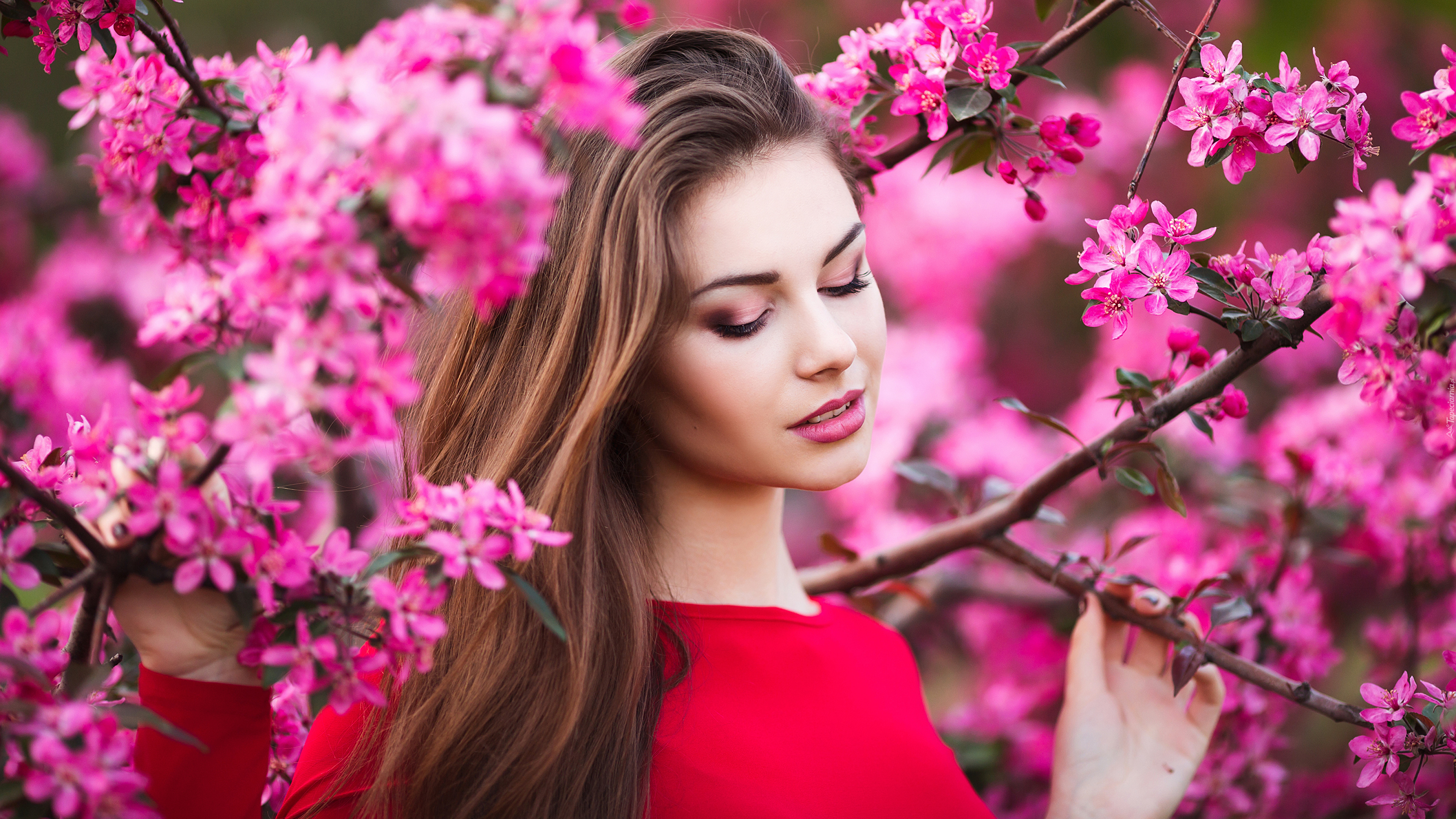 Edytor tapety: Kobieta pośród okwieconych gałązek