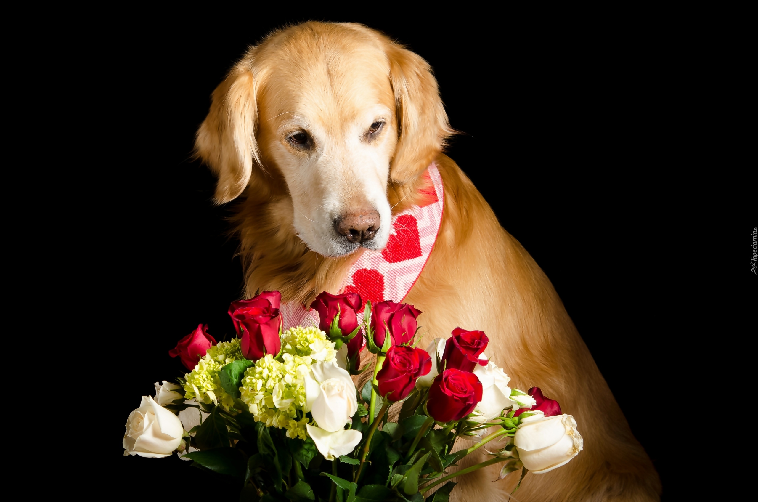 Edytor tapety: Golden retriever z różami