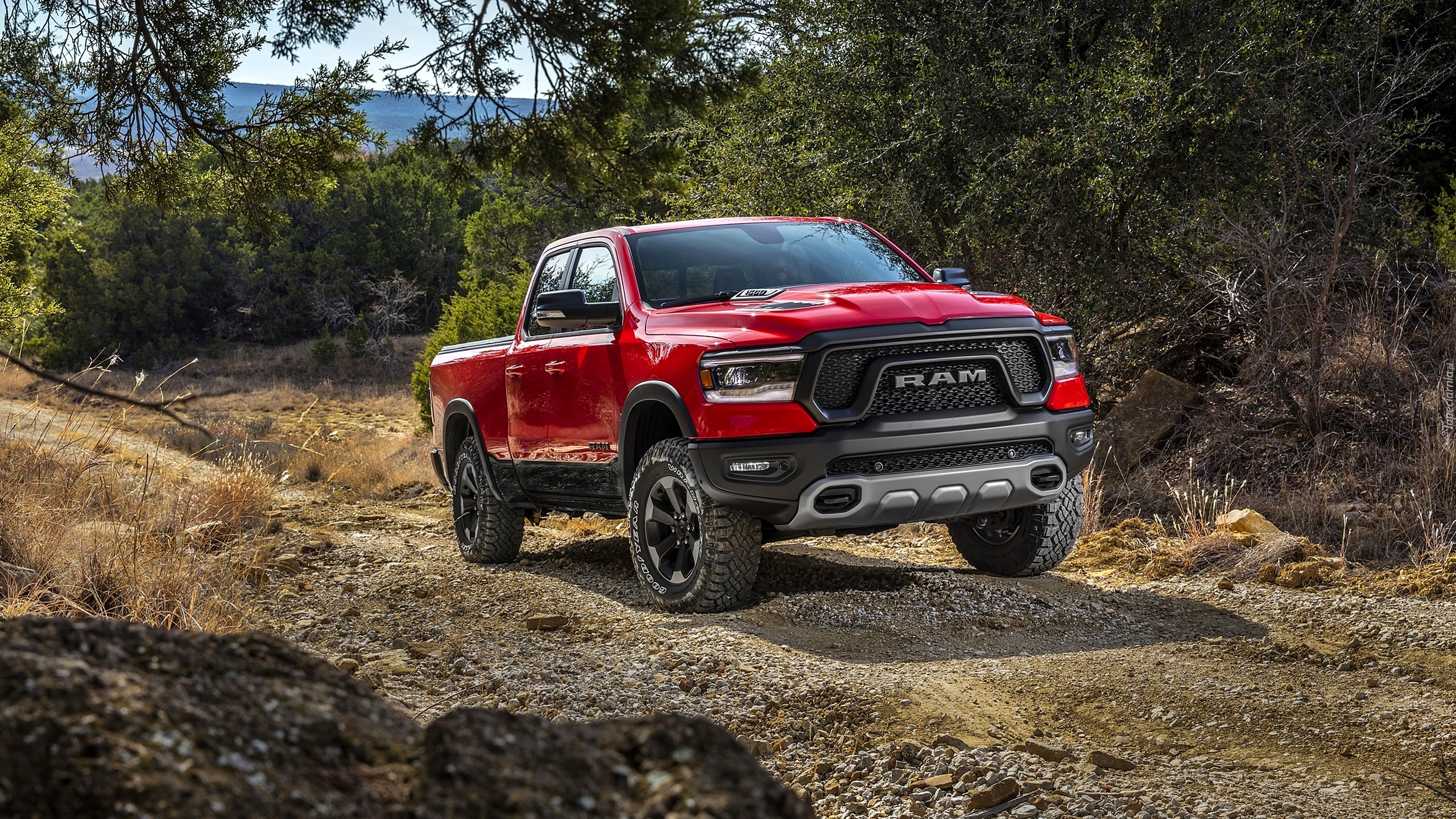 Edytor tapety: Dodge Ram 1500 Rebel na leśnej drodze