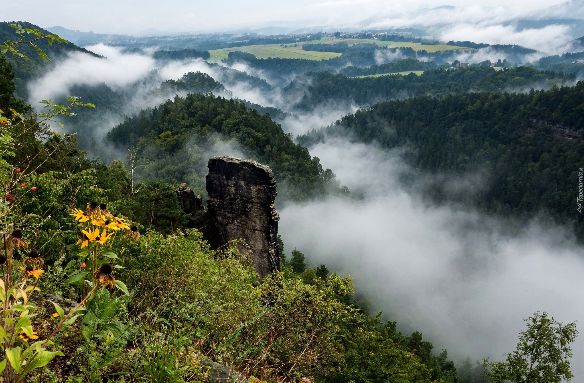 Edytor tapety: Mgła nad zalesionymi wzgórzami