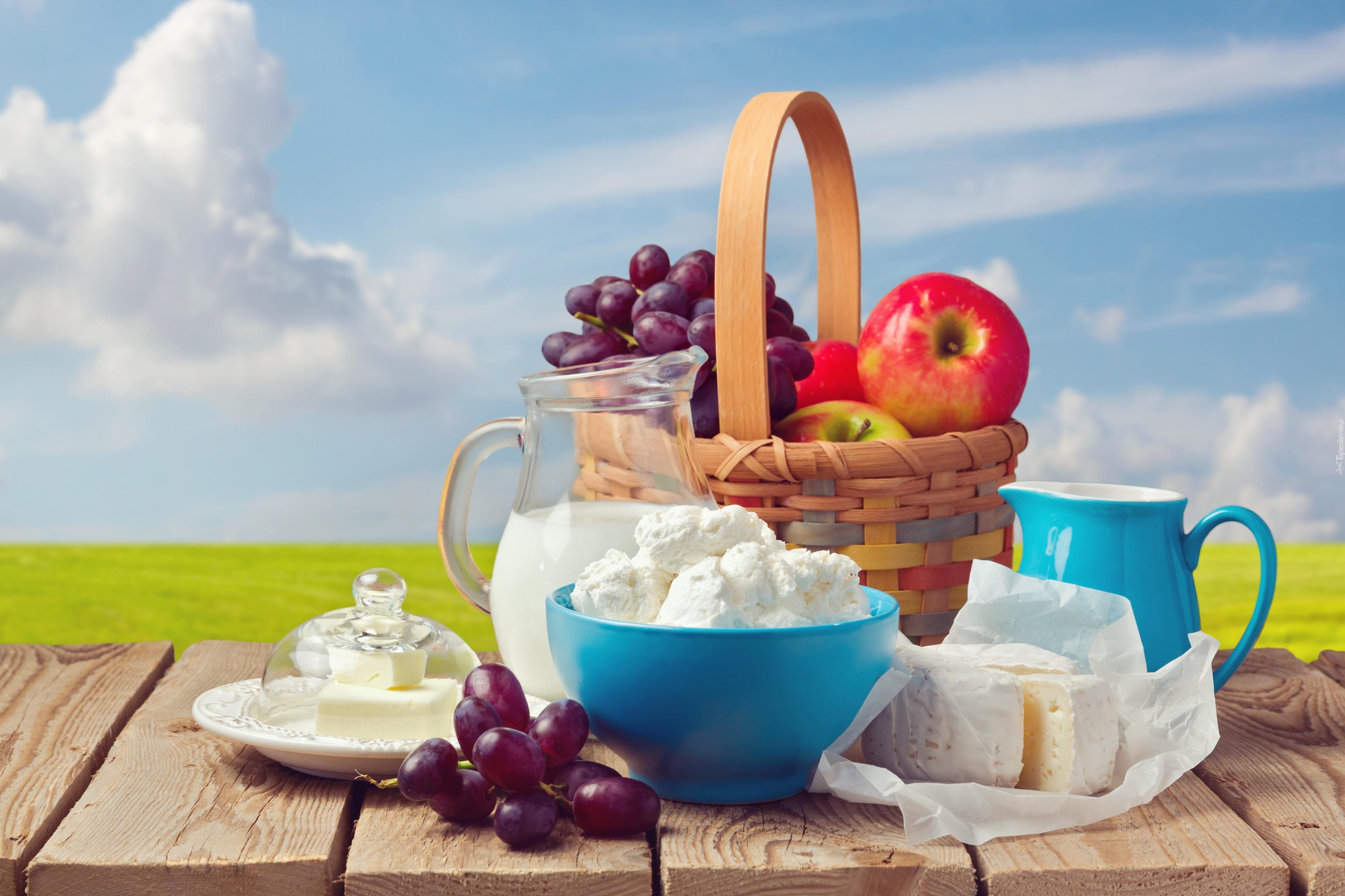 Edytor tapety: Sery i mleko obok koszyka z owocami