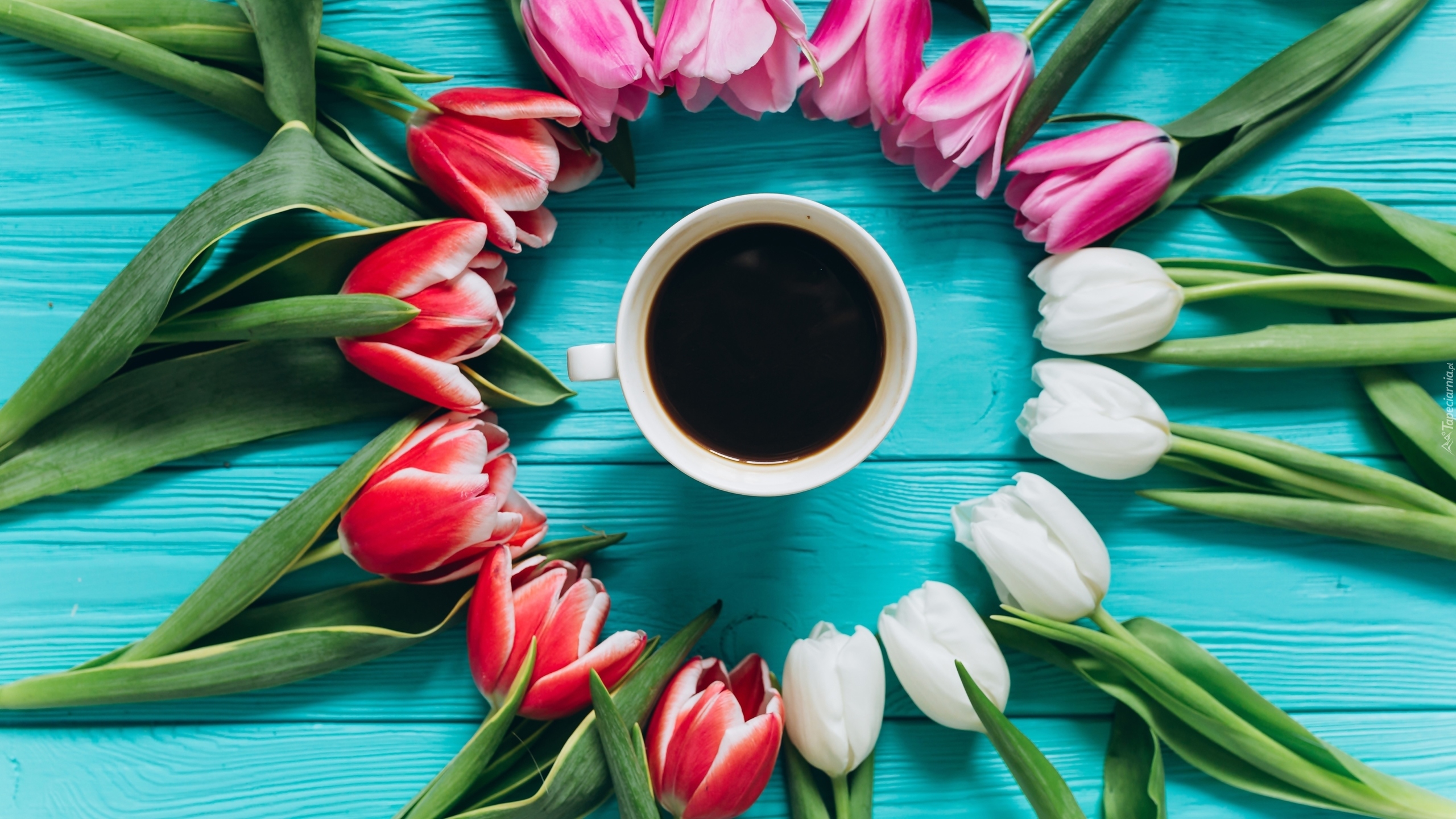 Edytor tapety: Tulipany ułożone wokół filiżanki z kawą