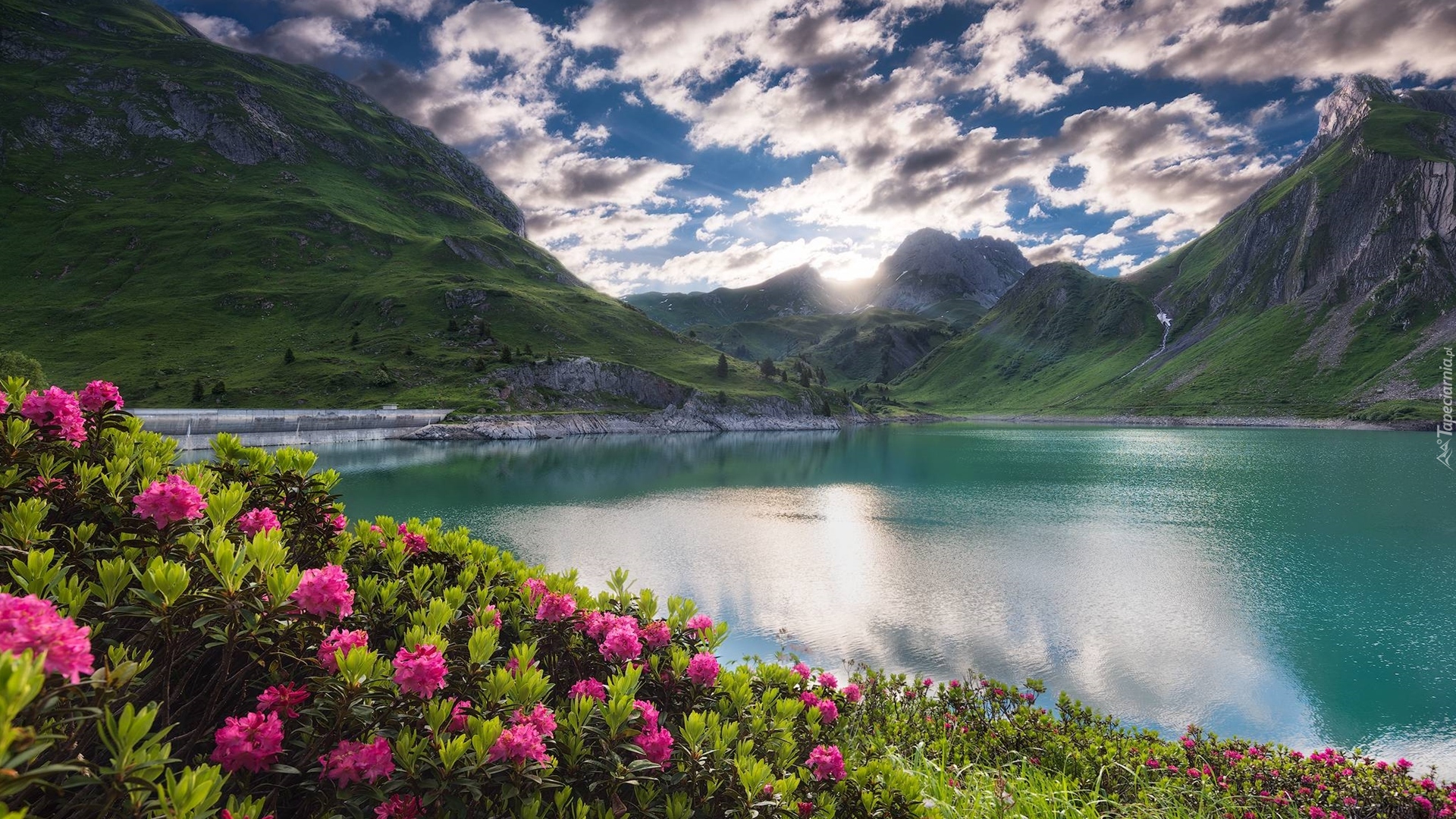 Edytor tapety: Różaneczniki nad górskim jeziorem