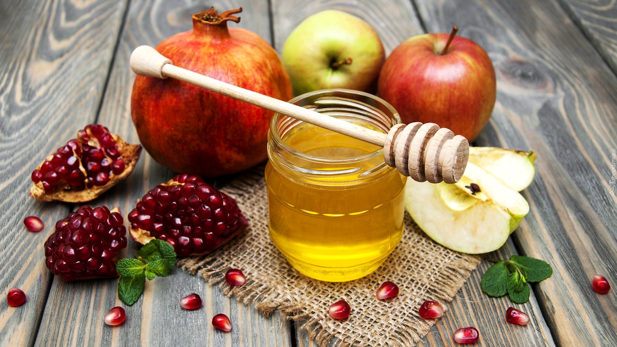 Edytor tapety: Granat i jabłka obok słoika z miodem