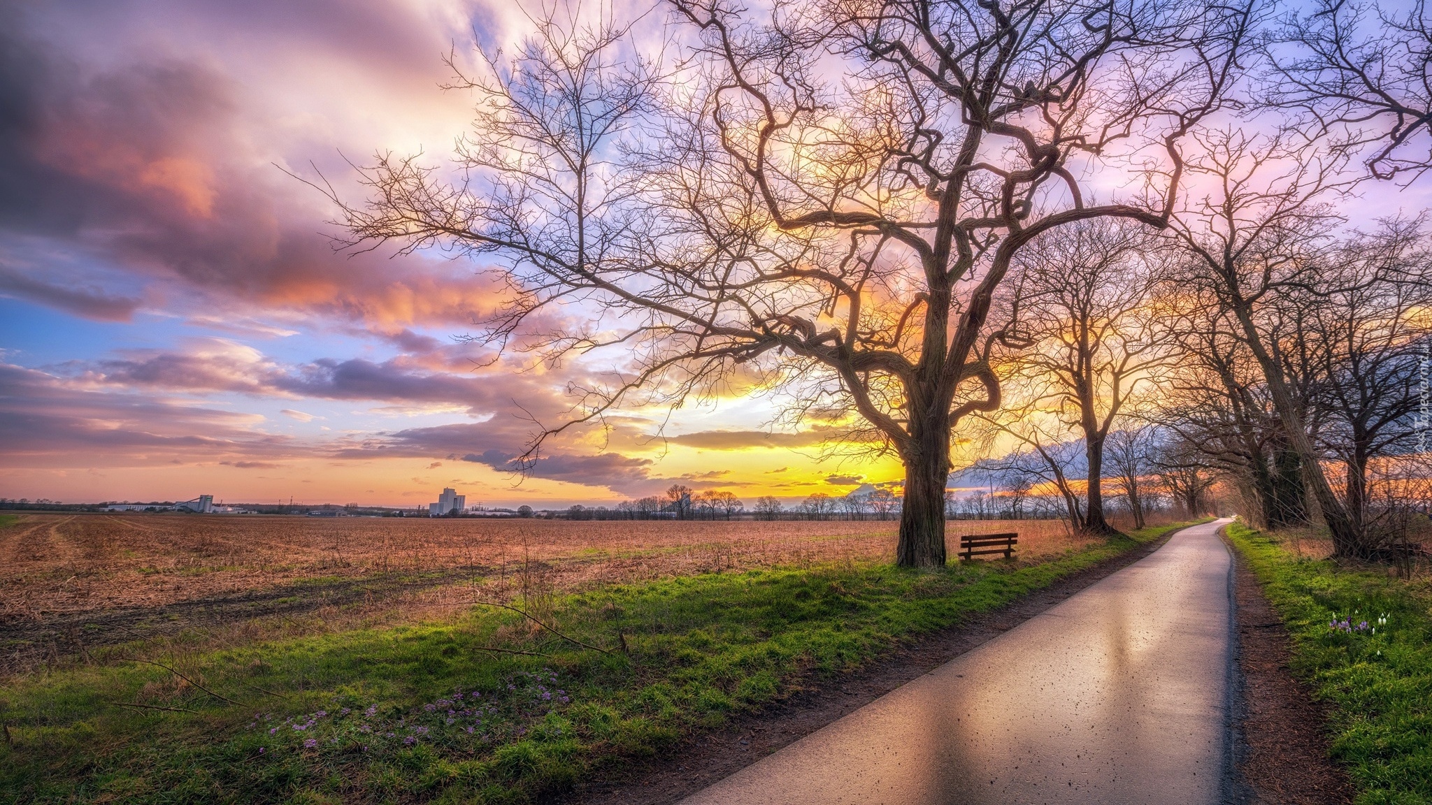 Edytor tapety: Ławka pod drzewem obok pola i drogi