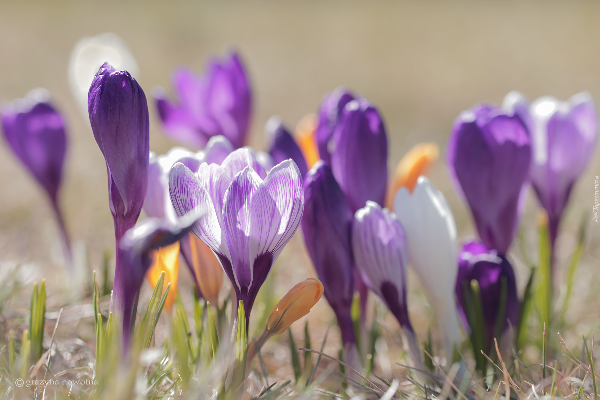 Edytor tapety: Krokusy fioletowe w trawie