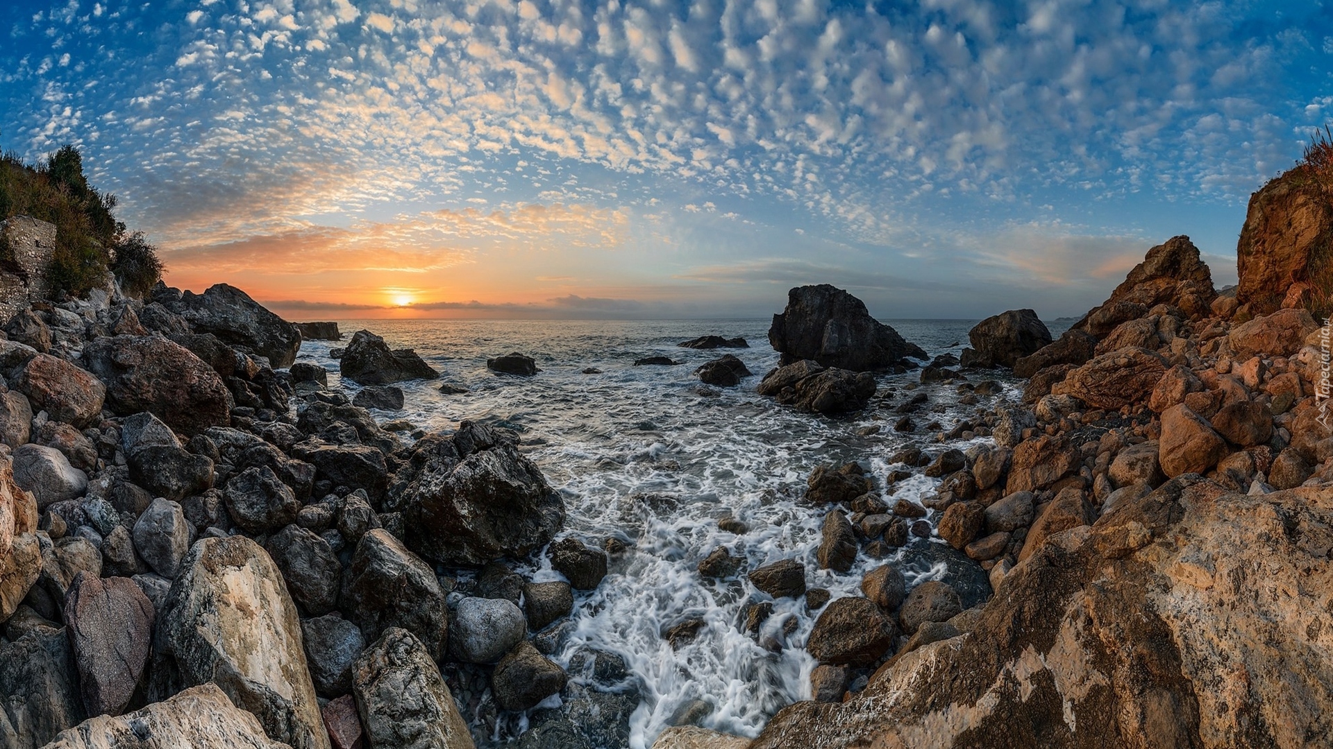 Edytor tapety: Zachód słońca na skalistym brzegu morza