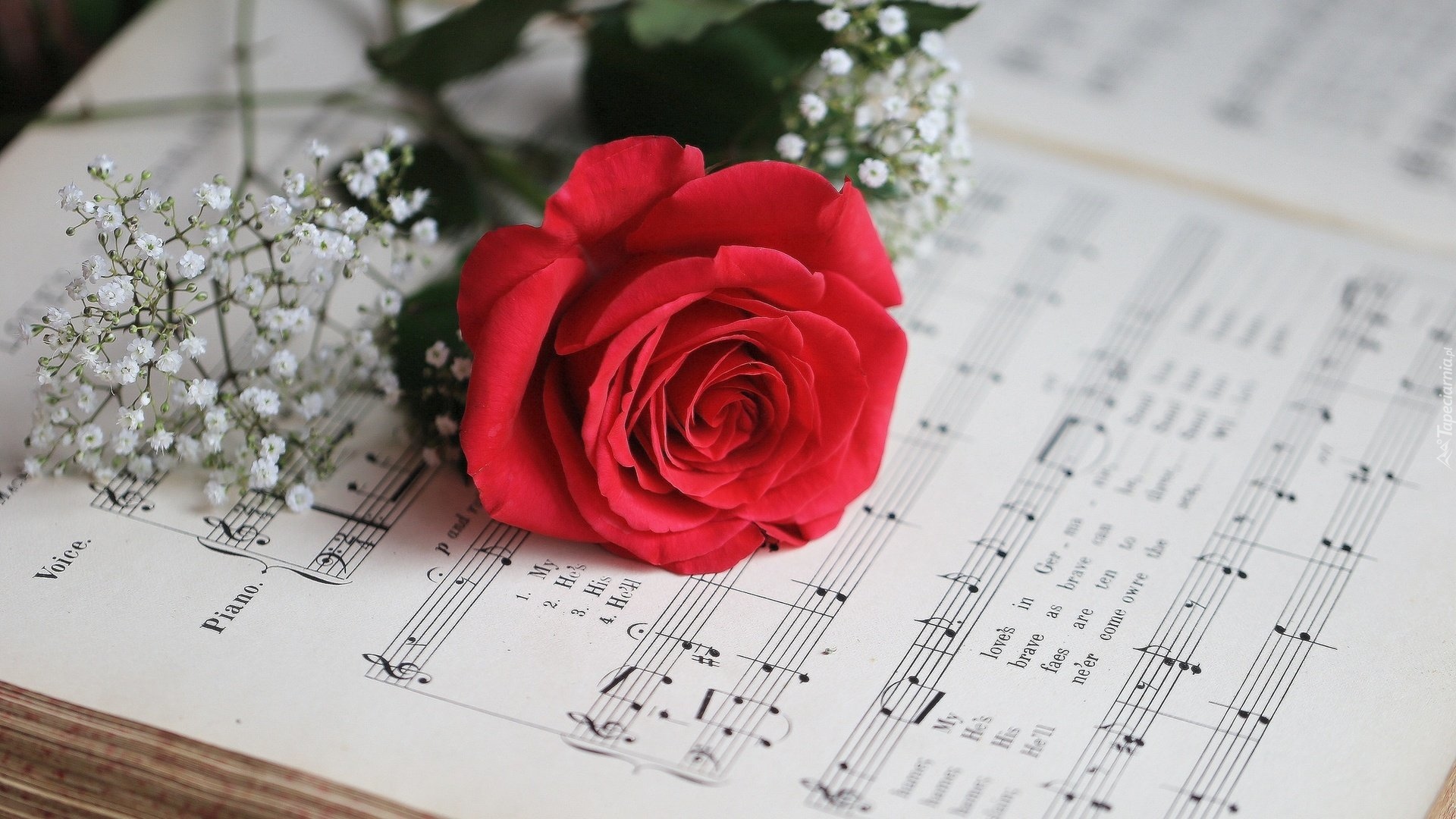 Edytor tapety: Czerwona róża leżąca na nutach