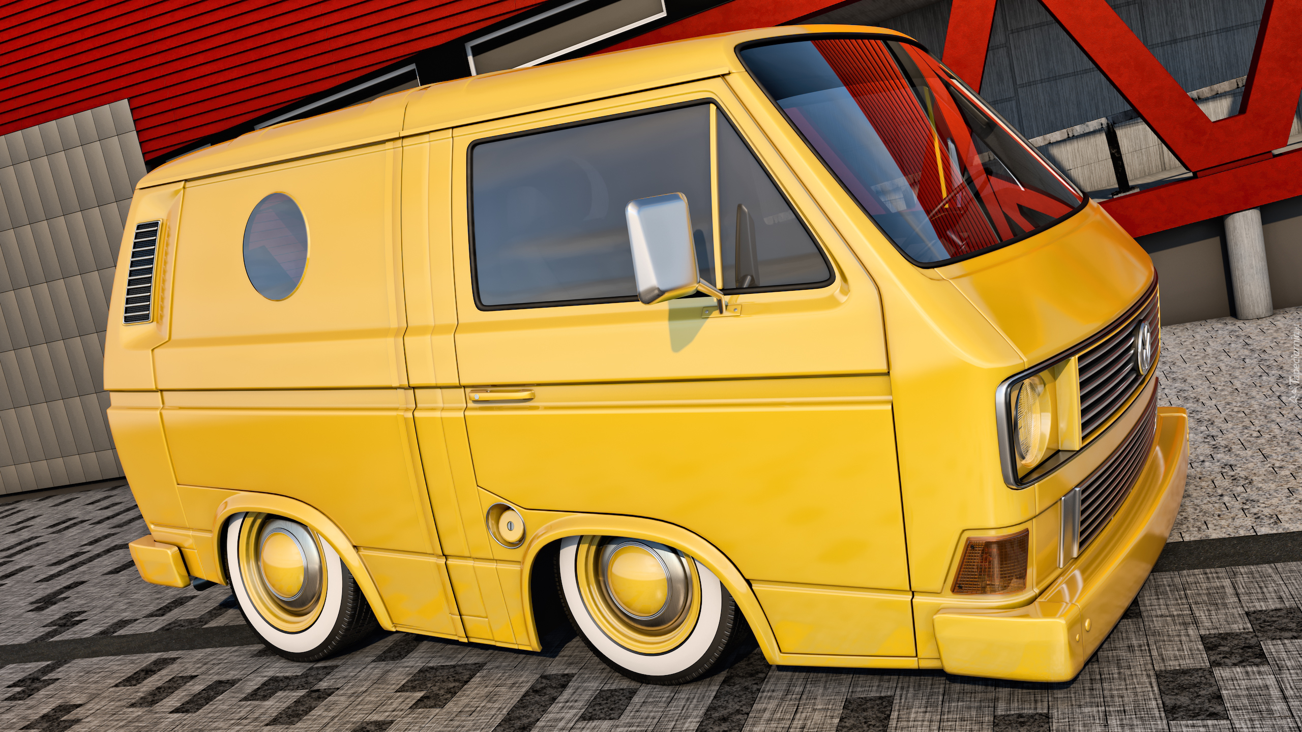 Edytor tapety: Żółty Volkswagen T3 Transporter bokiem
