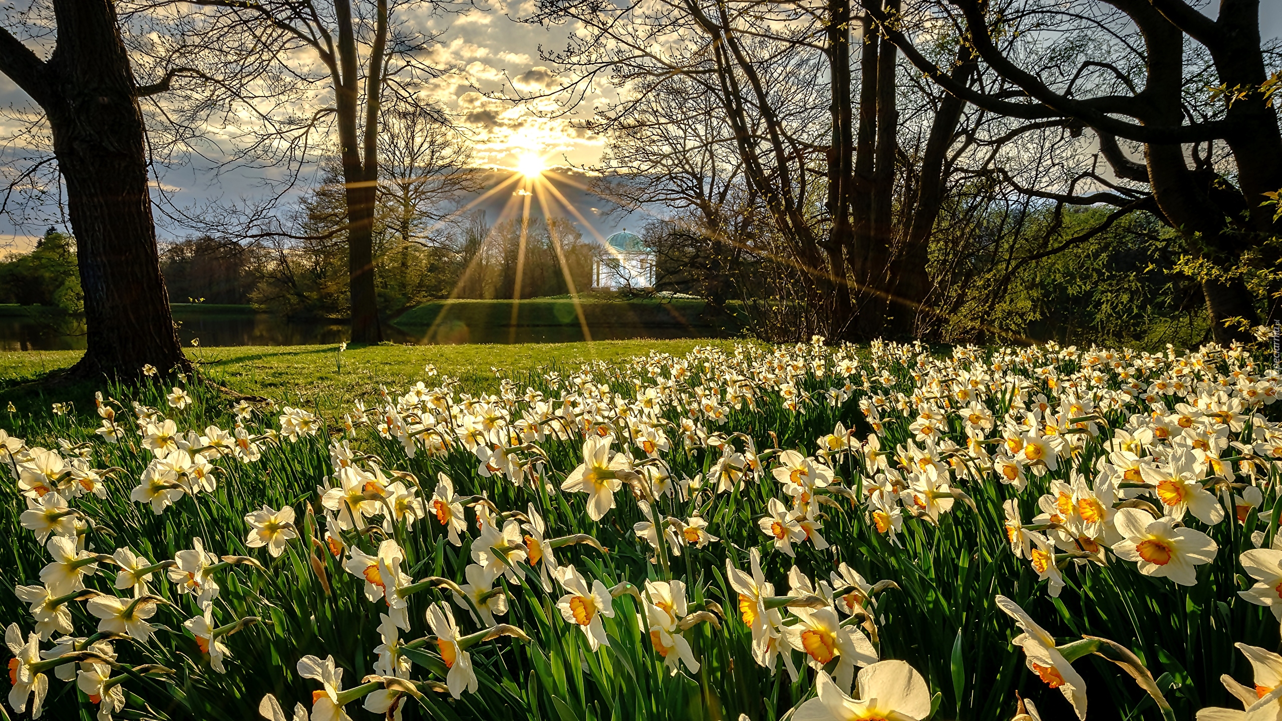 Edytor tapety: Narcyzy w parku w promieniach słońca