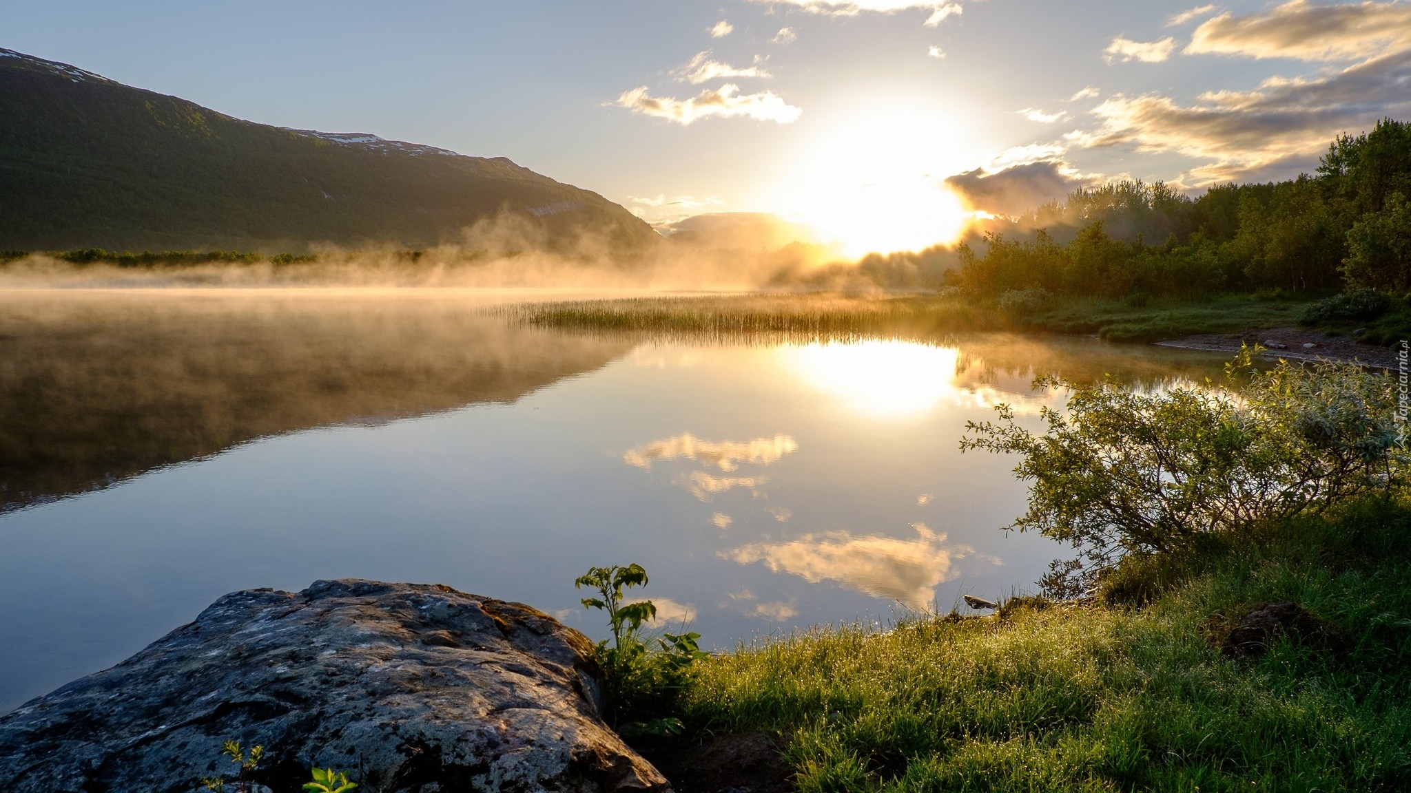 Edytor tapety: Wschód słońca nad jeziorem we mgle