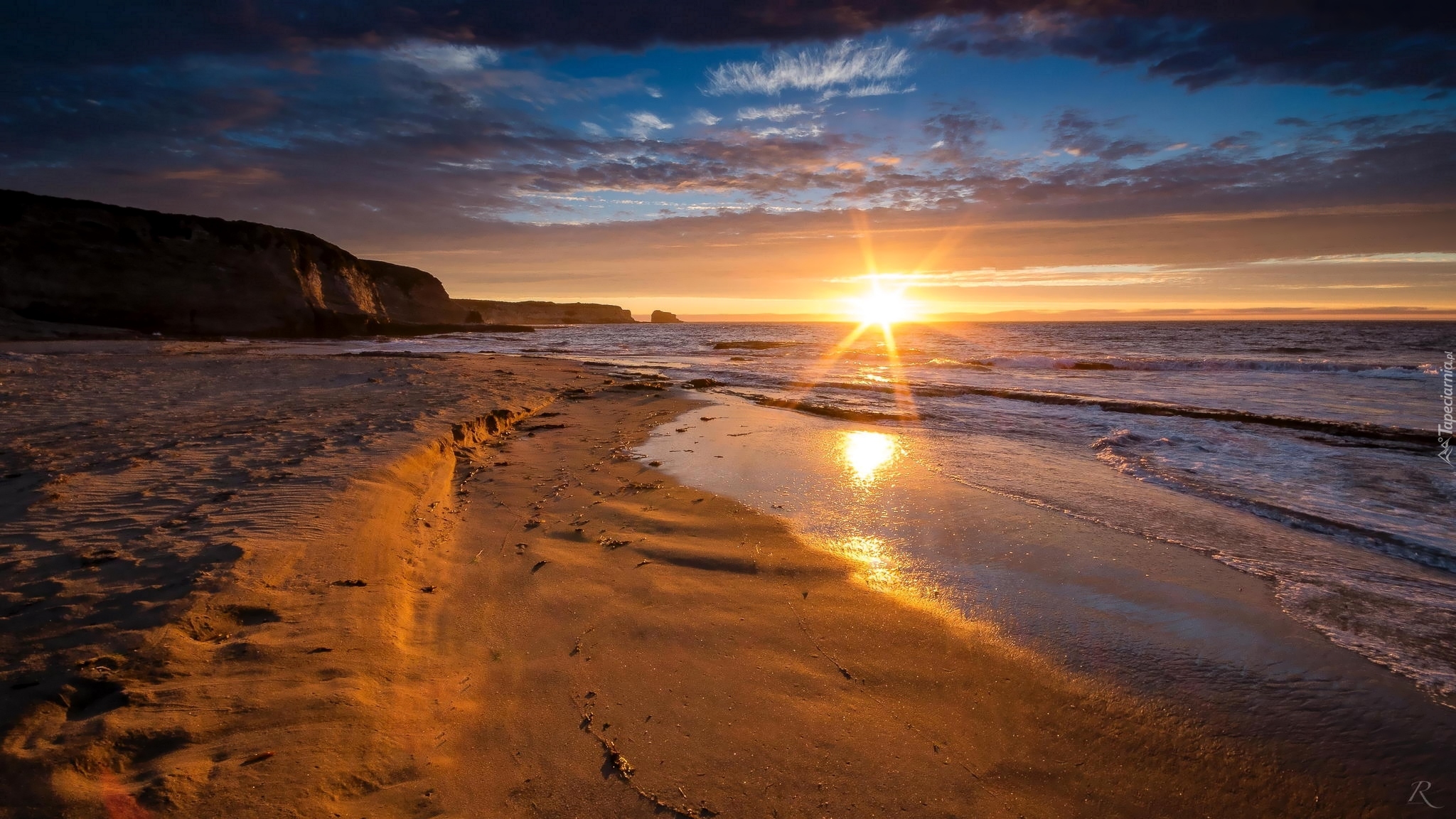 Edytor tapety: Morska plaża w blasku zachodzącego słońca