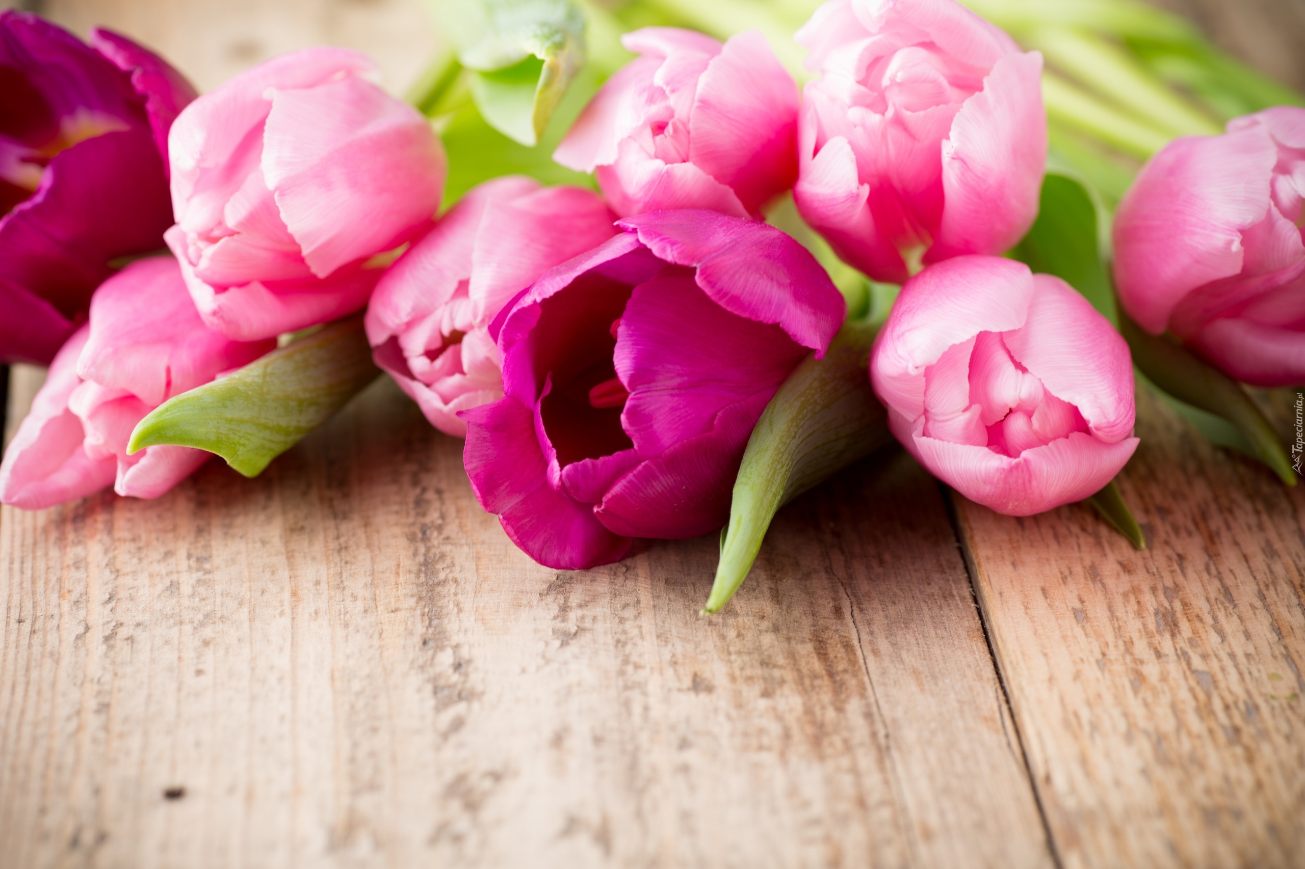 Edytor tapety: Różowe tulipany ułożone na deskach
