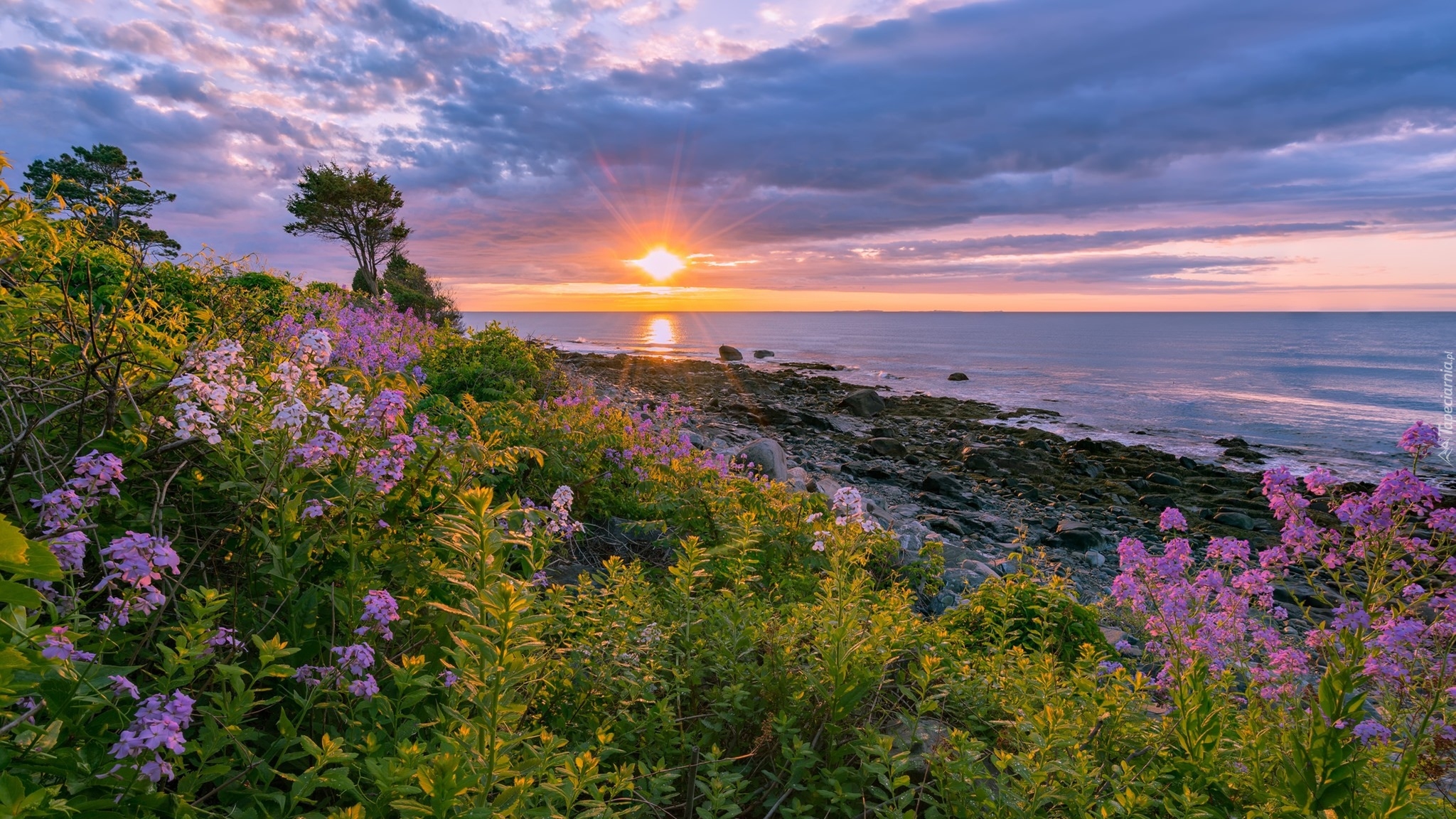 Edytor tapety: Kwiaty na tle wschodu słońca nad morzem