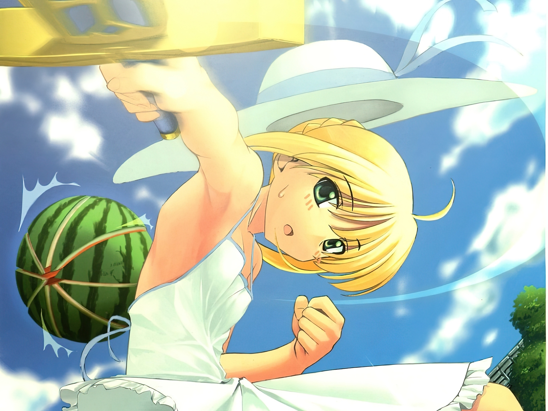 Edytor tapety: Fate Stay Night, arbuz, dziewczyna, kapelusz, miecz