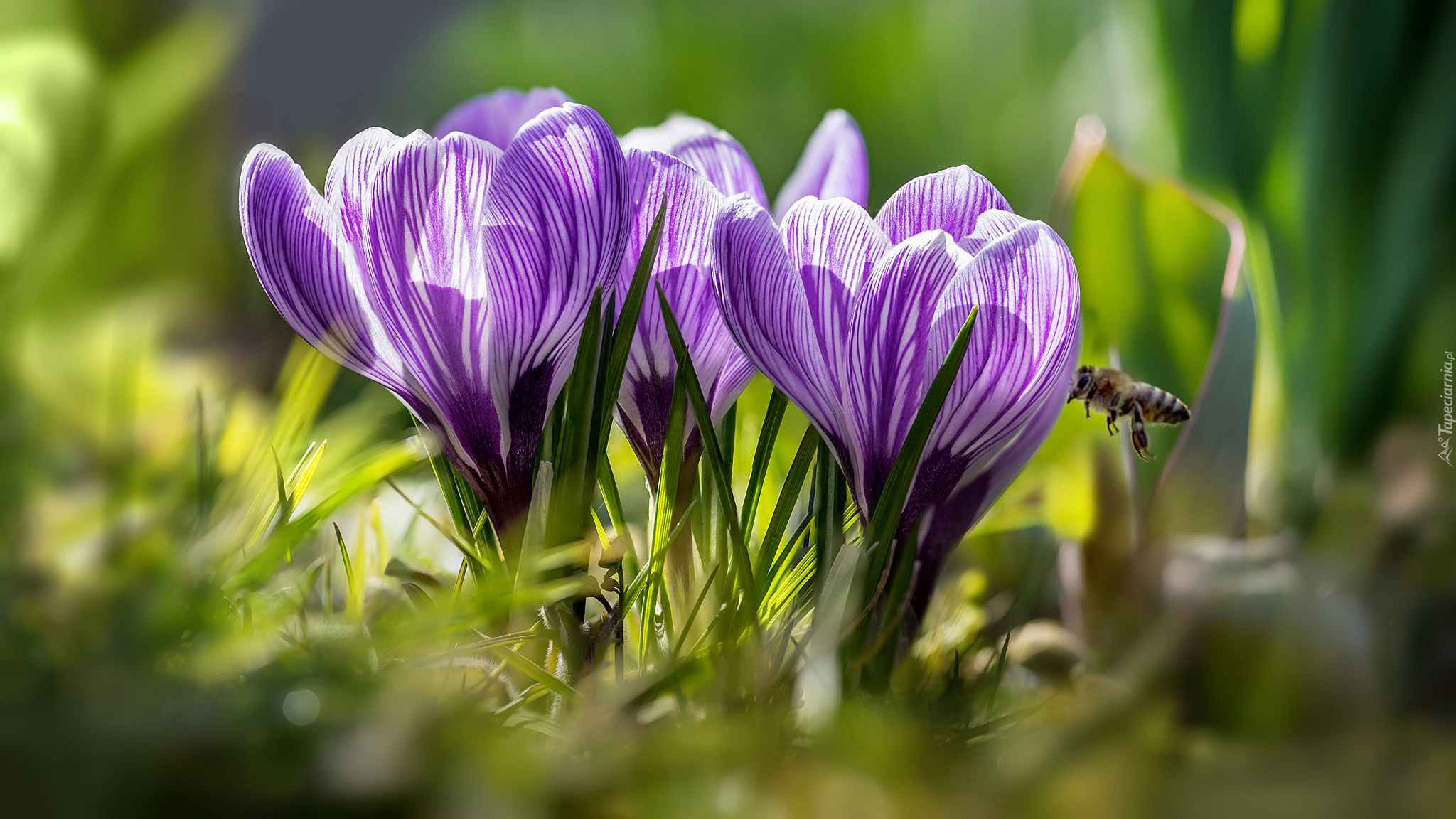 Edytor tapety: Pszczoła obok fioletowych krokusów
