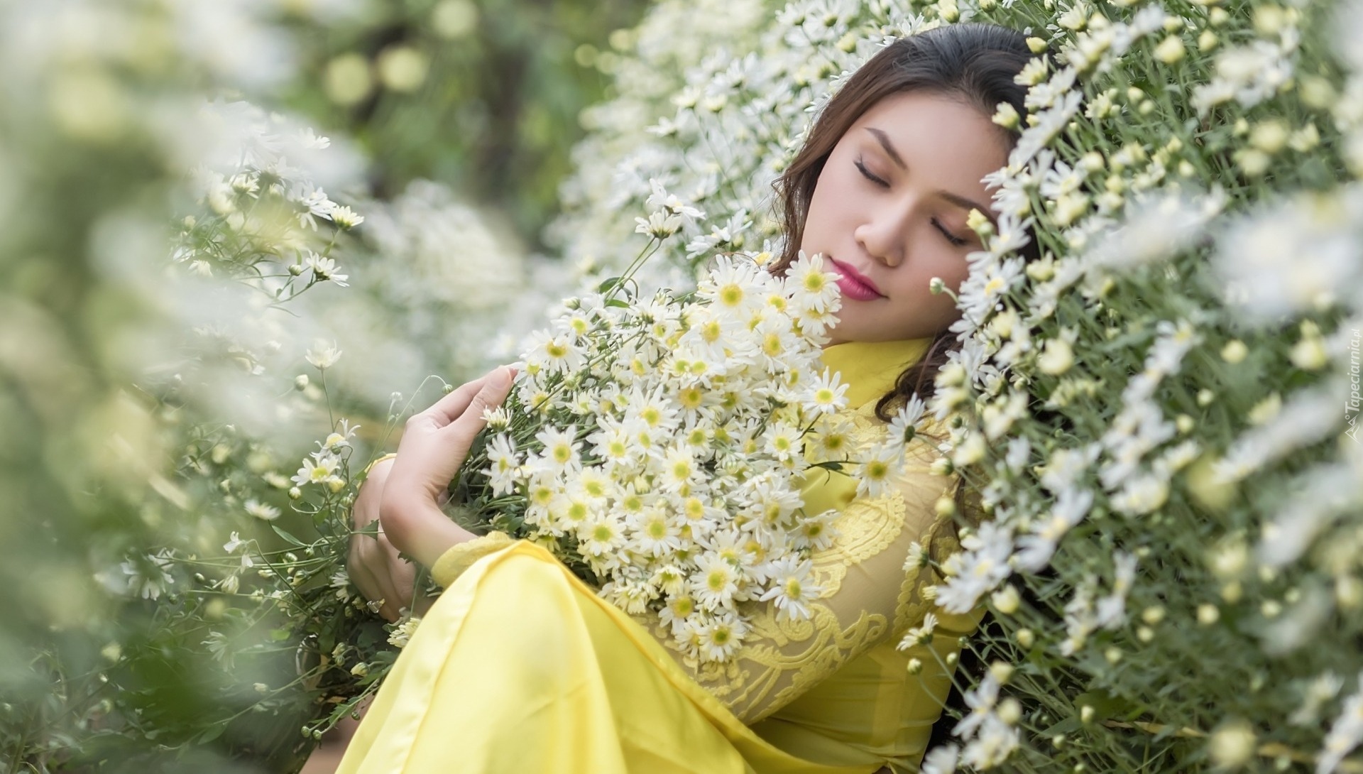 Edytor tapety: Dziewczyna w żółtej sukience wśród kwiatów