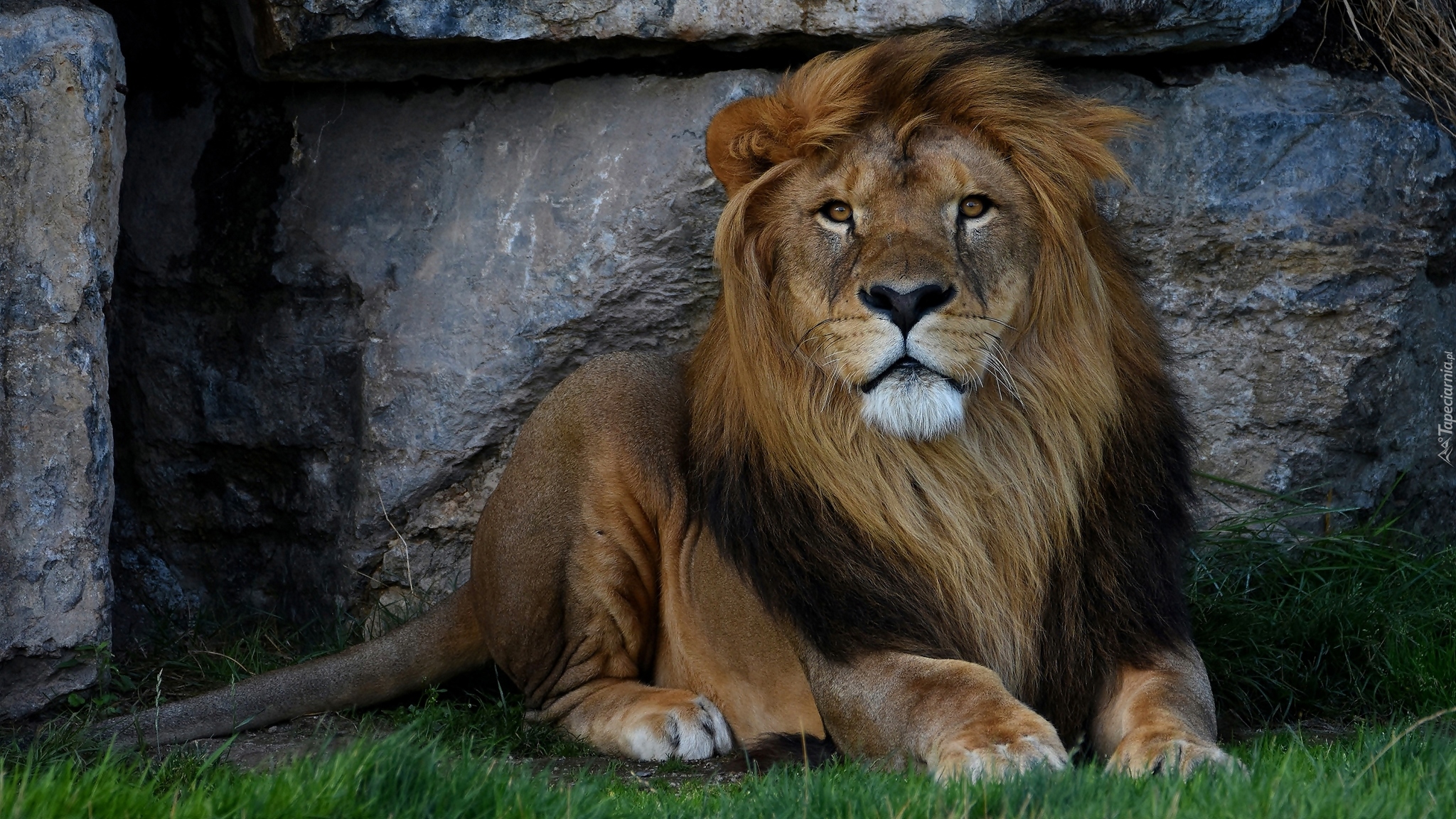 Edytor tapety: Lew na trawie obok muru