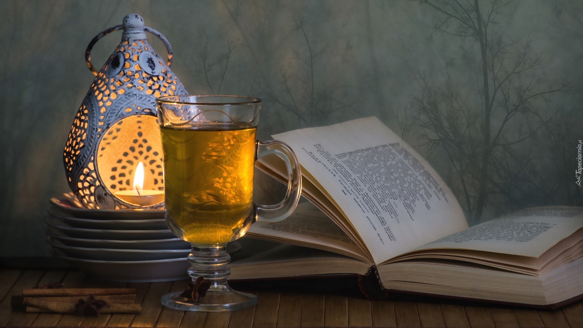 Edytor tapety: Szklanka herbaty przy lampionie i książce
