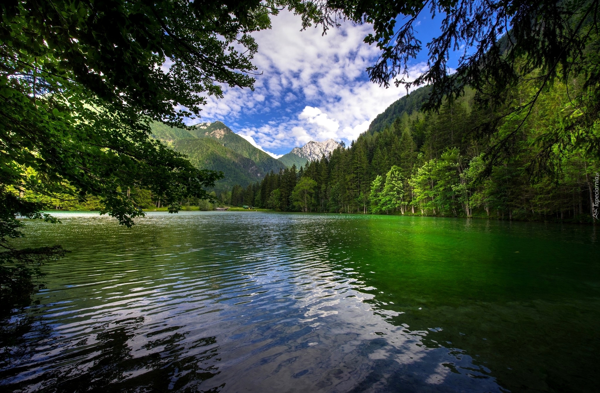 Edytor tapety: Jezioro pomiędzy zalesionymi wzgórzami