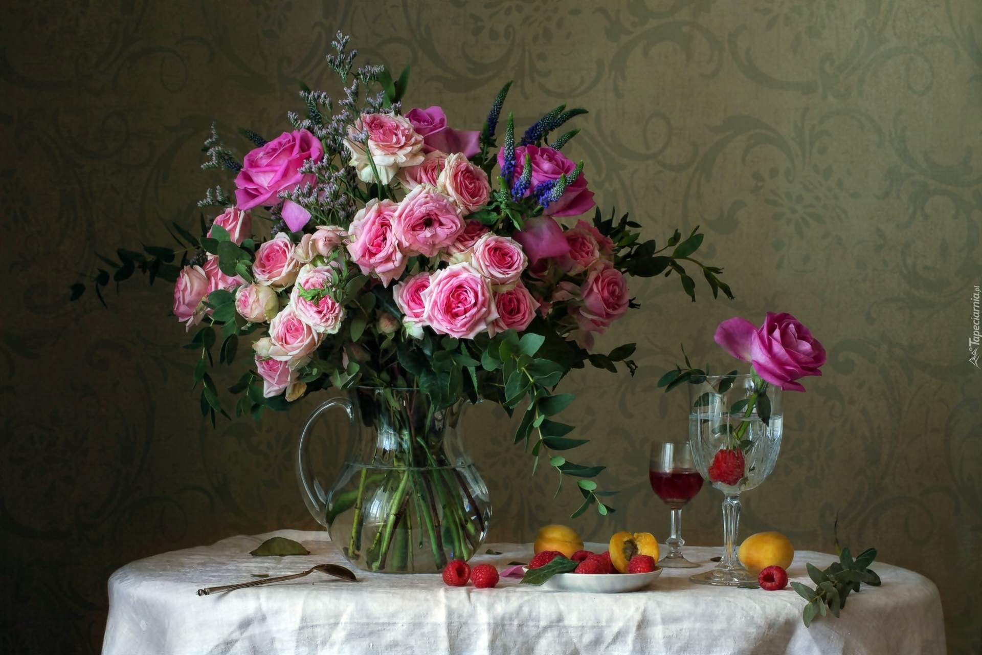 Edytor tapety: Róże w szklanym dzbanku na stoliku
