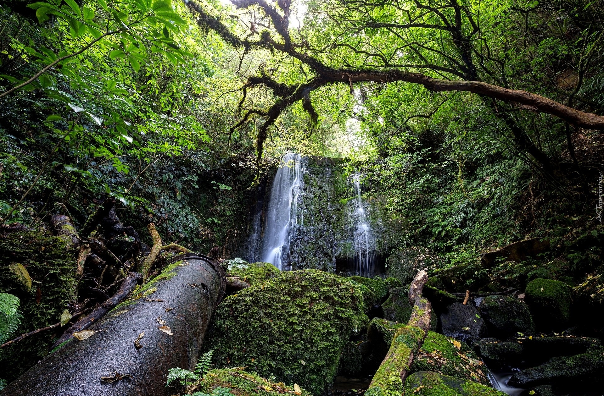 Edytor tapety: Wodospad i omszałe kamienie w lesie