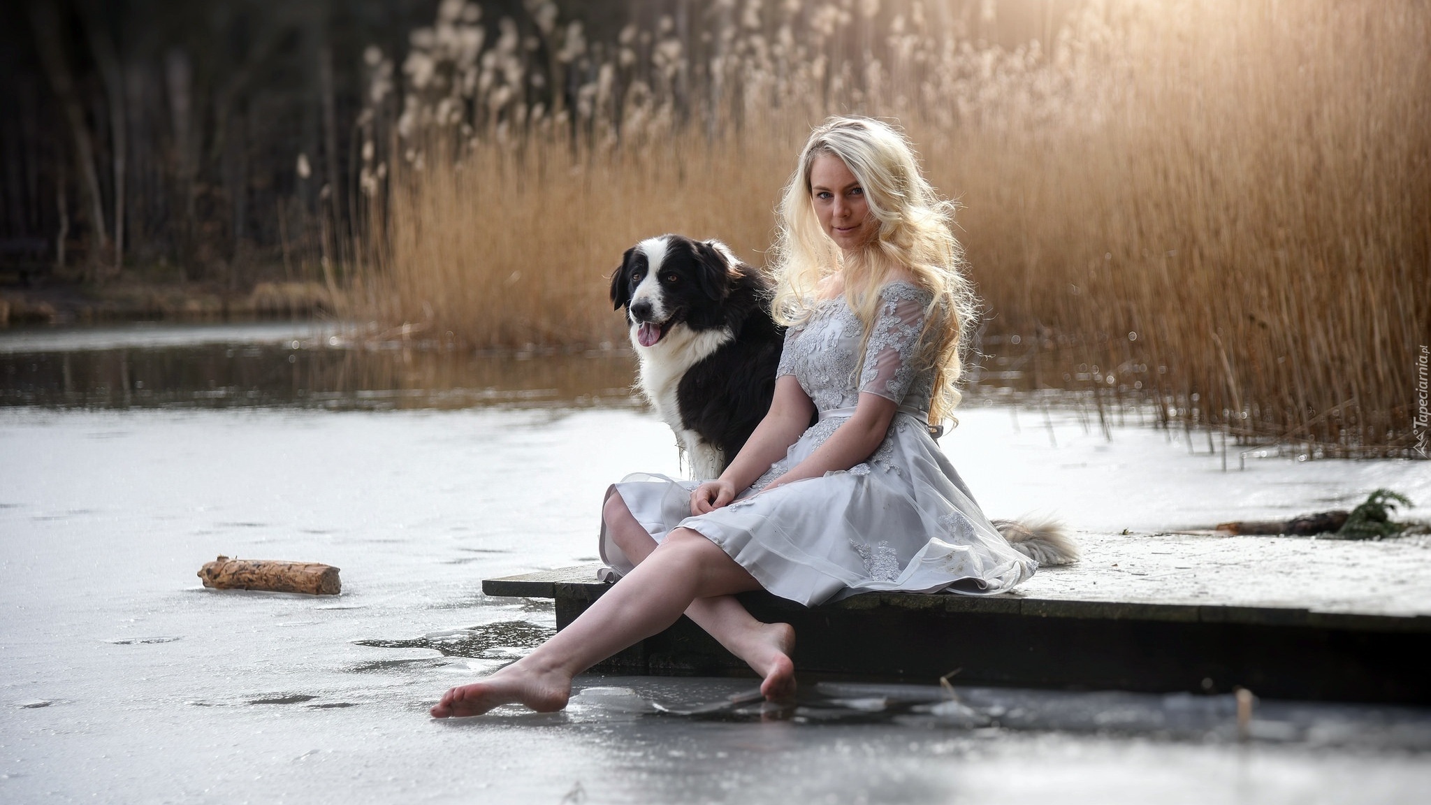 Edytor tapety: Blondynka z border collie na pomoście