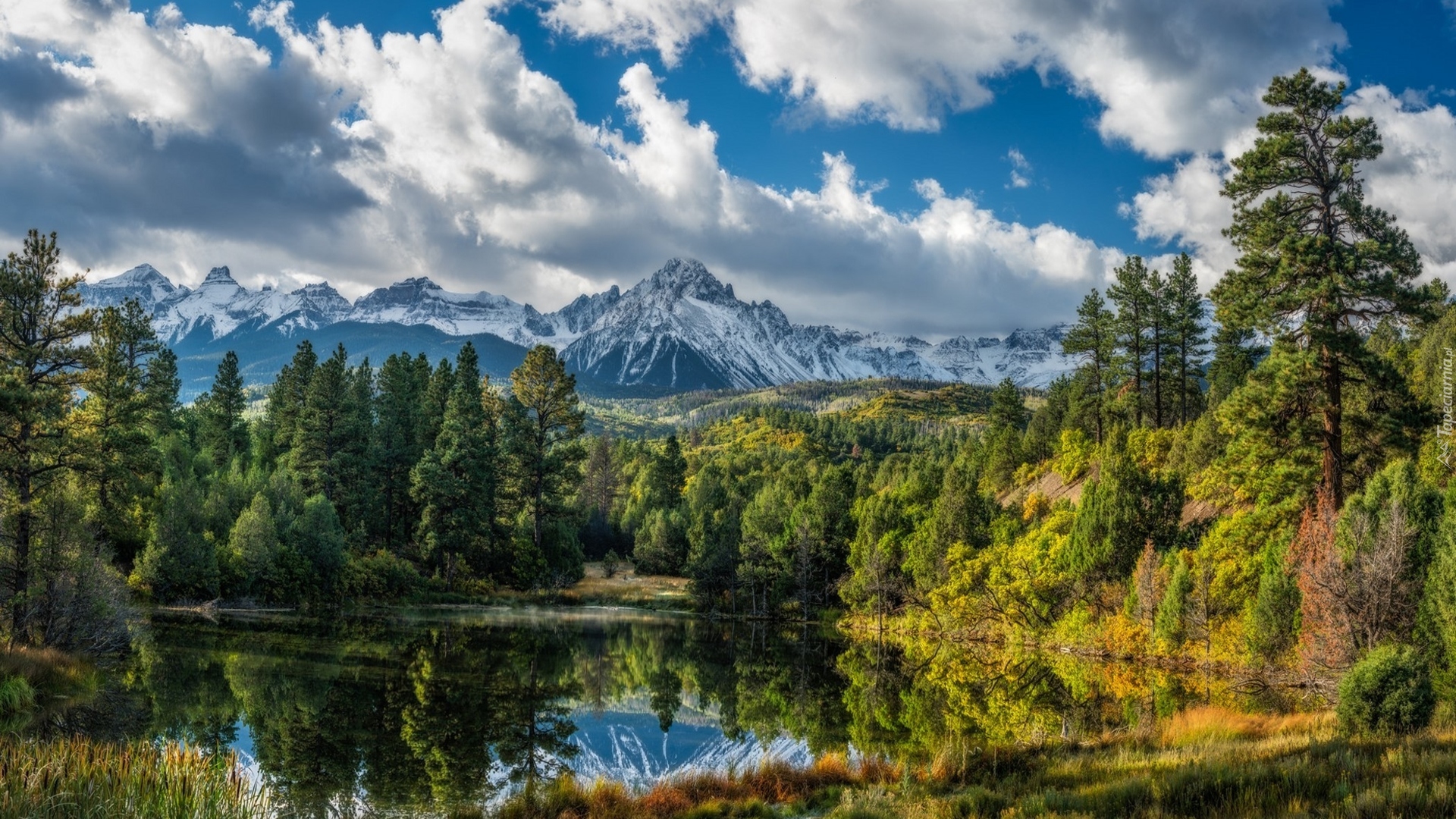 Edytor tapety: Jezioro otoczone lasami na tle gór