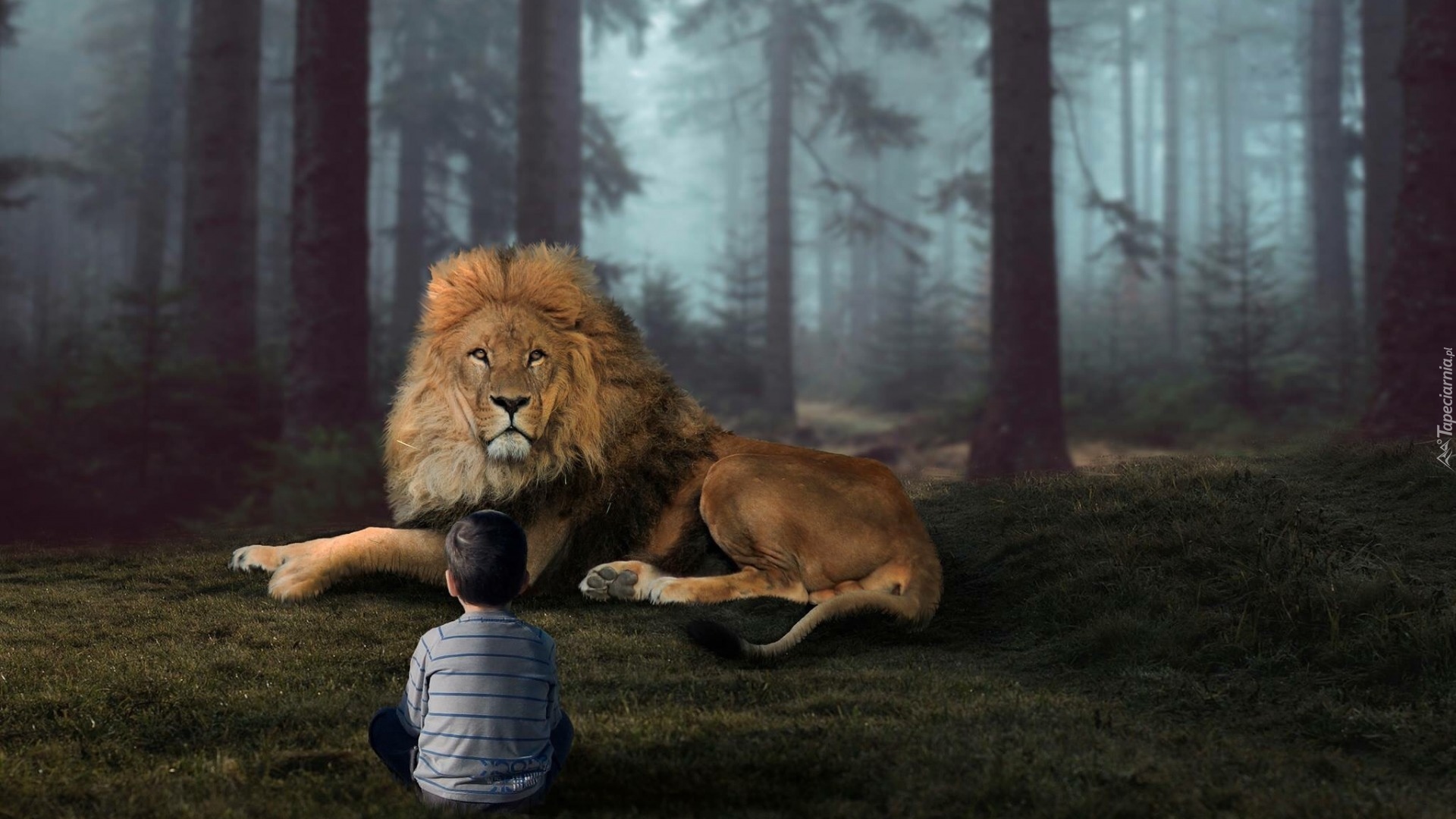 Edytor tapety: Chłopiec z lwem w lesie