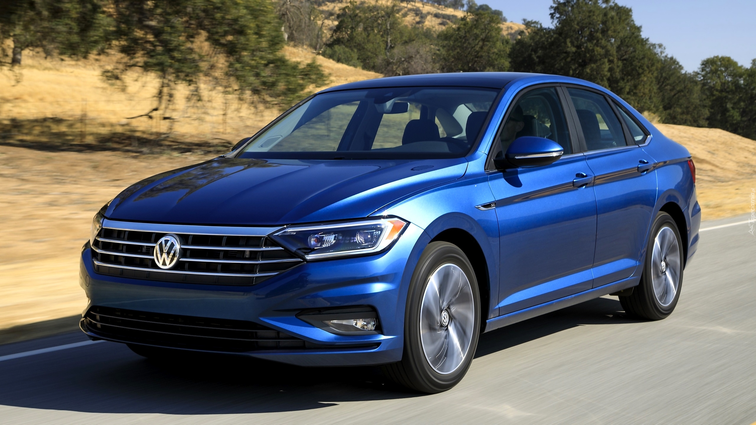 Edytor tapety: Niebieski Volkswagen Jetta na drodze
