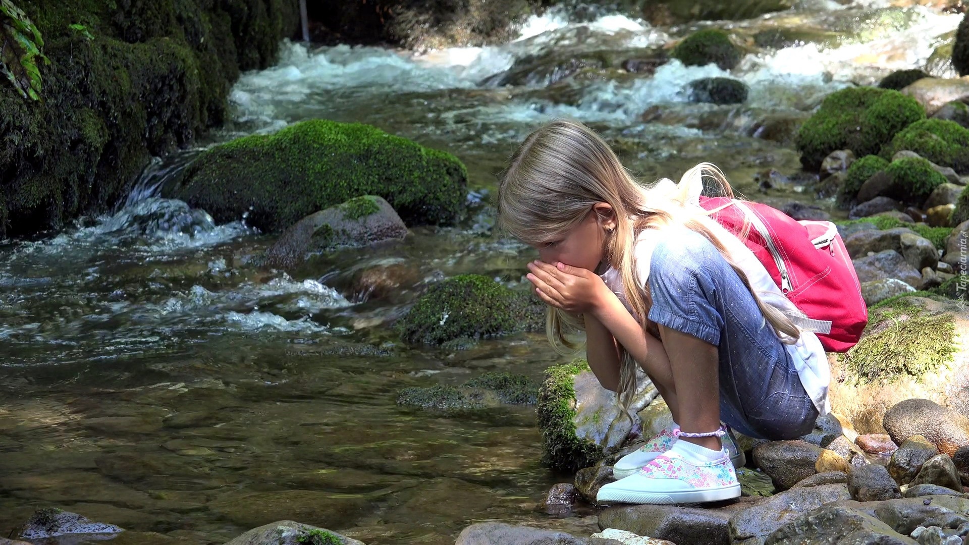 Edytor tapety: Dziewczynka z plecakiem nad rzeką