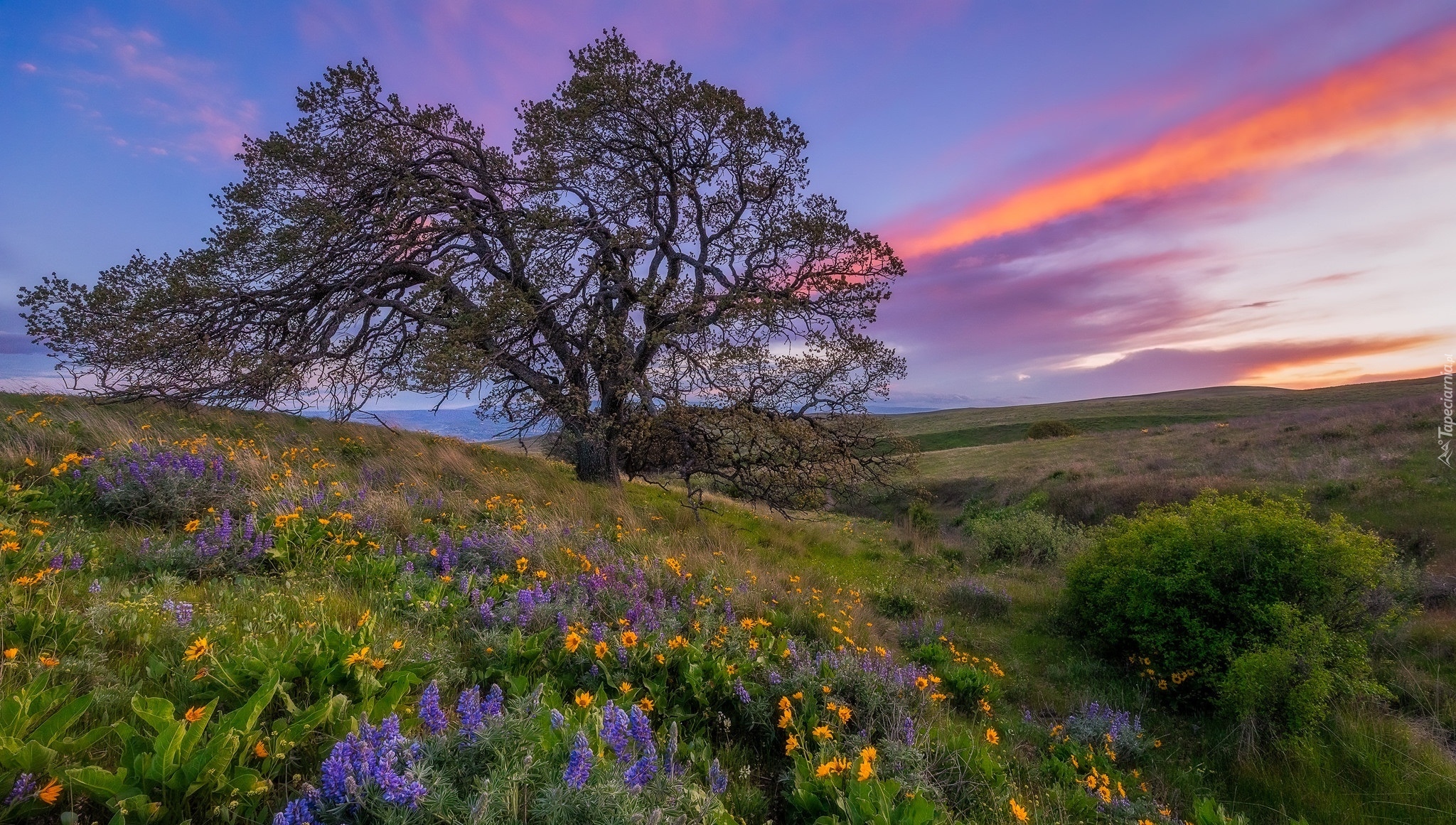 Edytor tapety: Zachód słońca nad kwiecistą łąką z drzewem