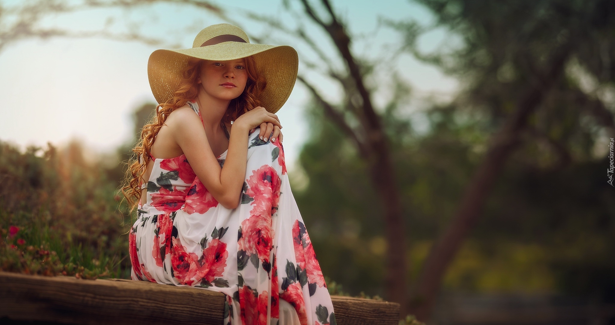 Edytor tapety: Rudowłosa dziewczyna w letniej sukience i kapeluszu