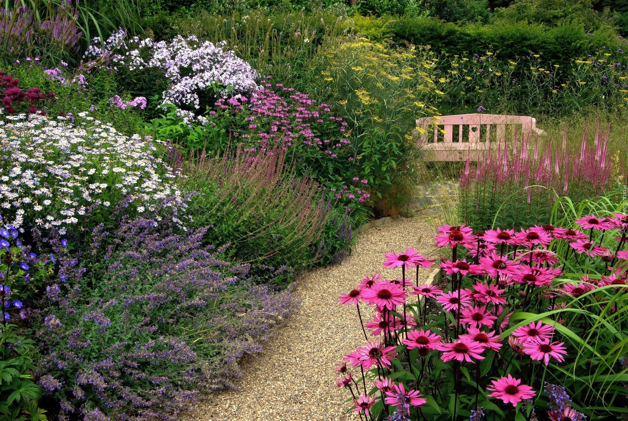 Edytor tapety: Ławeczka wśród kwiatów w parku