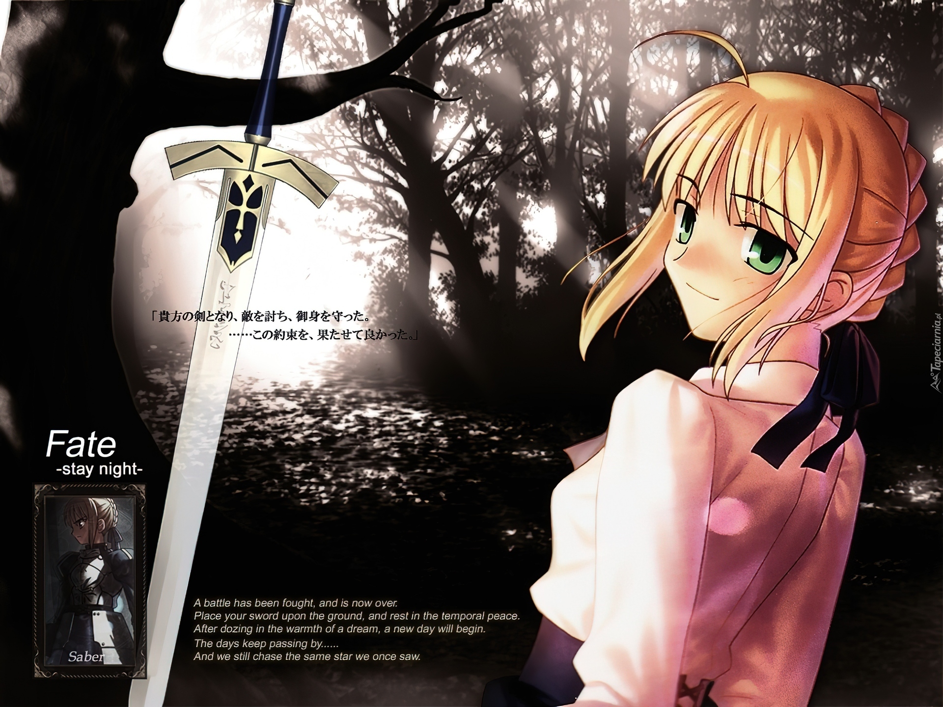 Edytor tapety: Fate Stay Night, kobieta, miecz, zdjęcie, napisy, las