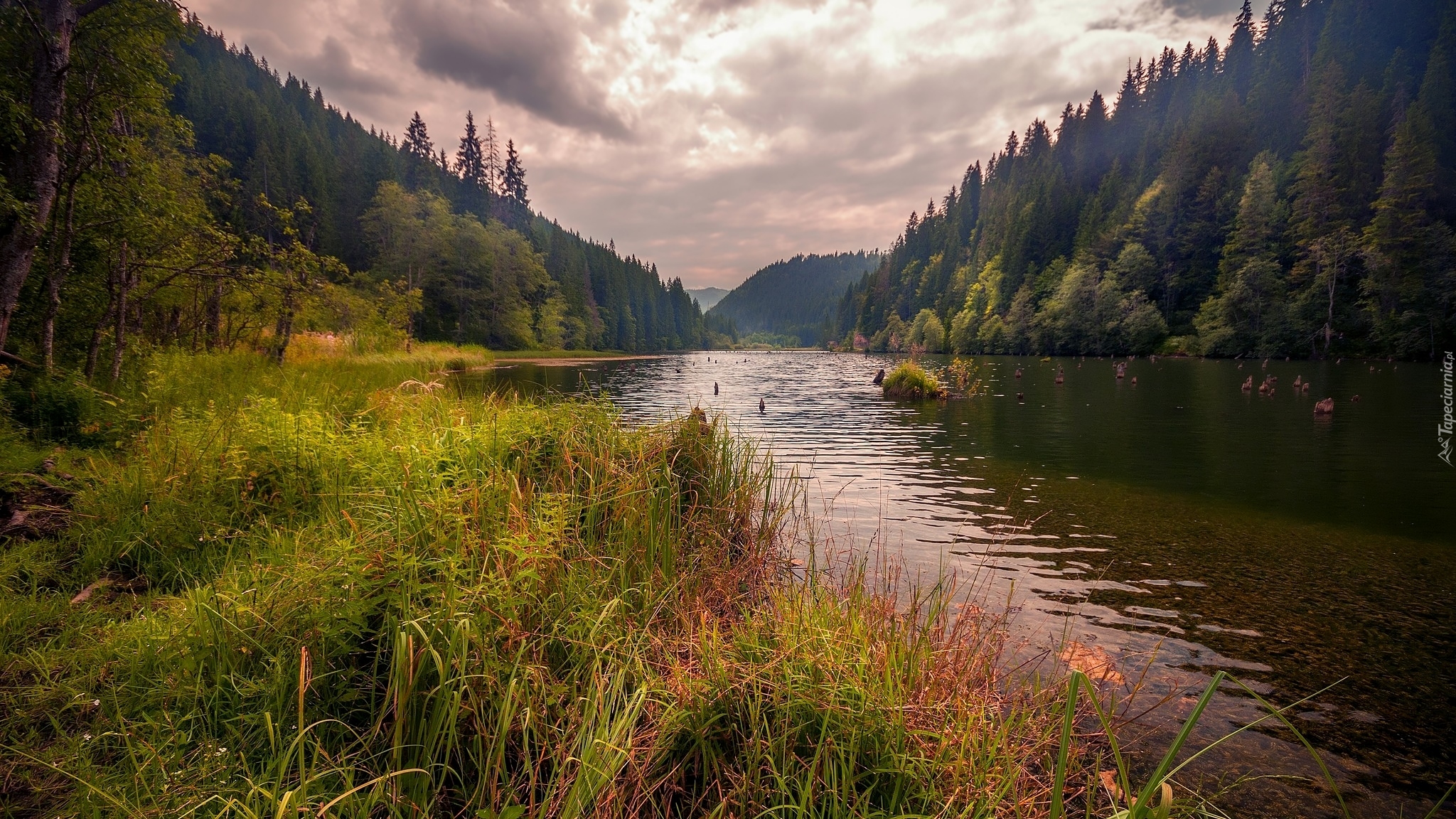 Edytor tapety: Rzeka płynąca pomiędzy zalesionymi wzgórzami