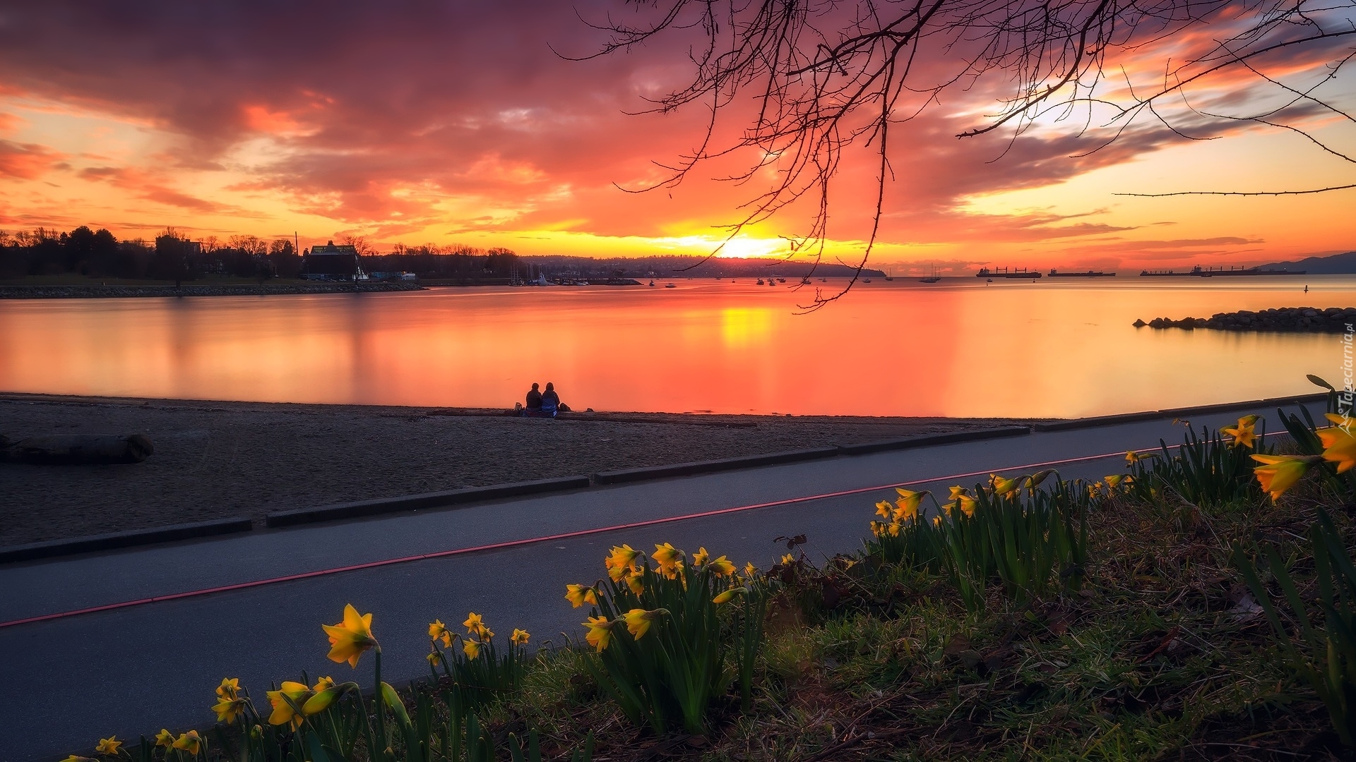 Edytor tapety: Droga obok jeziora na tle zachodzącego słońca