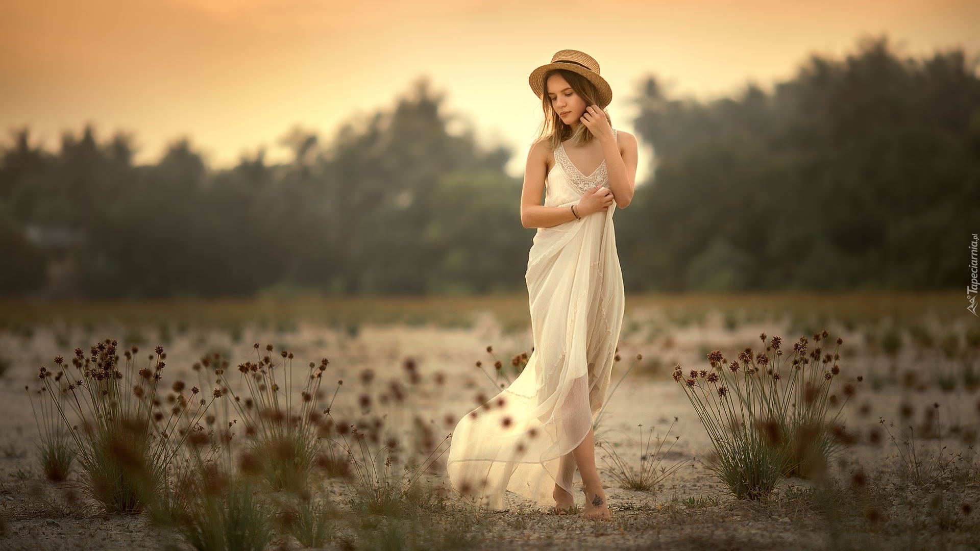 Edytor tapety: Dziewczyna w kapeluszu i białej sukience