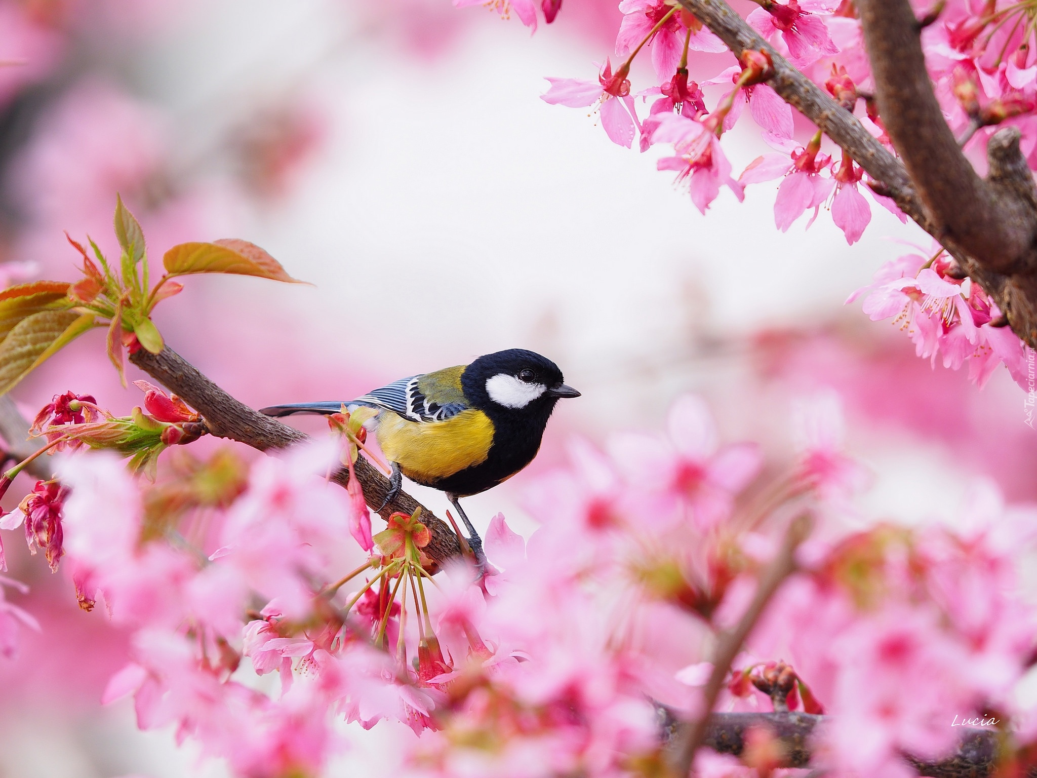 Edytor tapety: Sikorka na kwitnącym drzewie