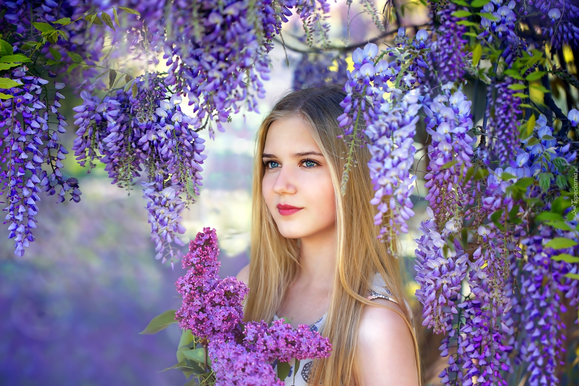 Edytor tapety: Gałązki glicynii nad dziewczyną z bukietem bzu