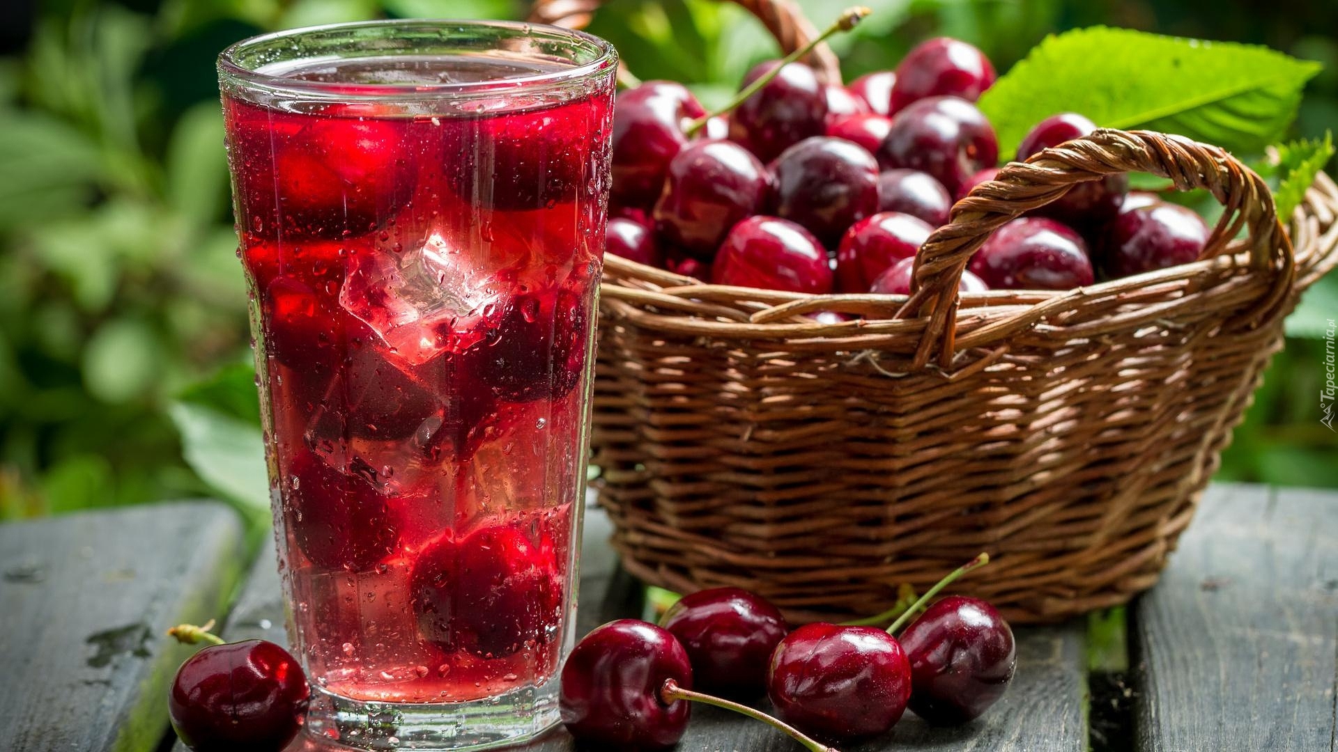 Edytor tapety: Napój w szklance obok koszyka z wiśniami